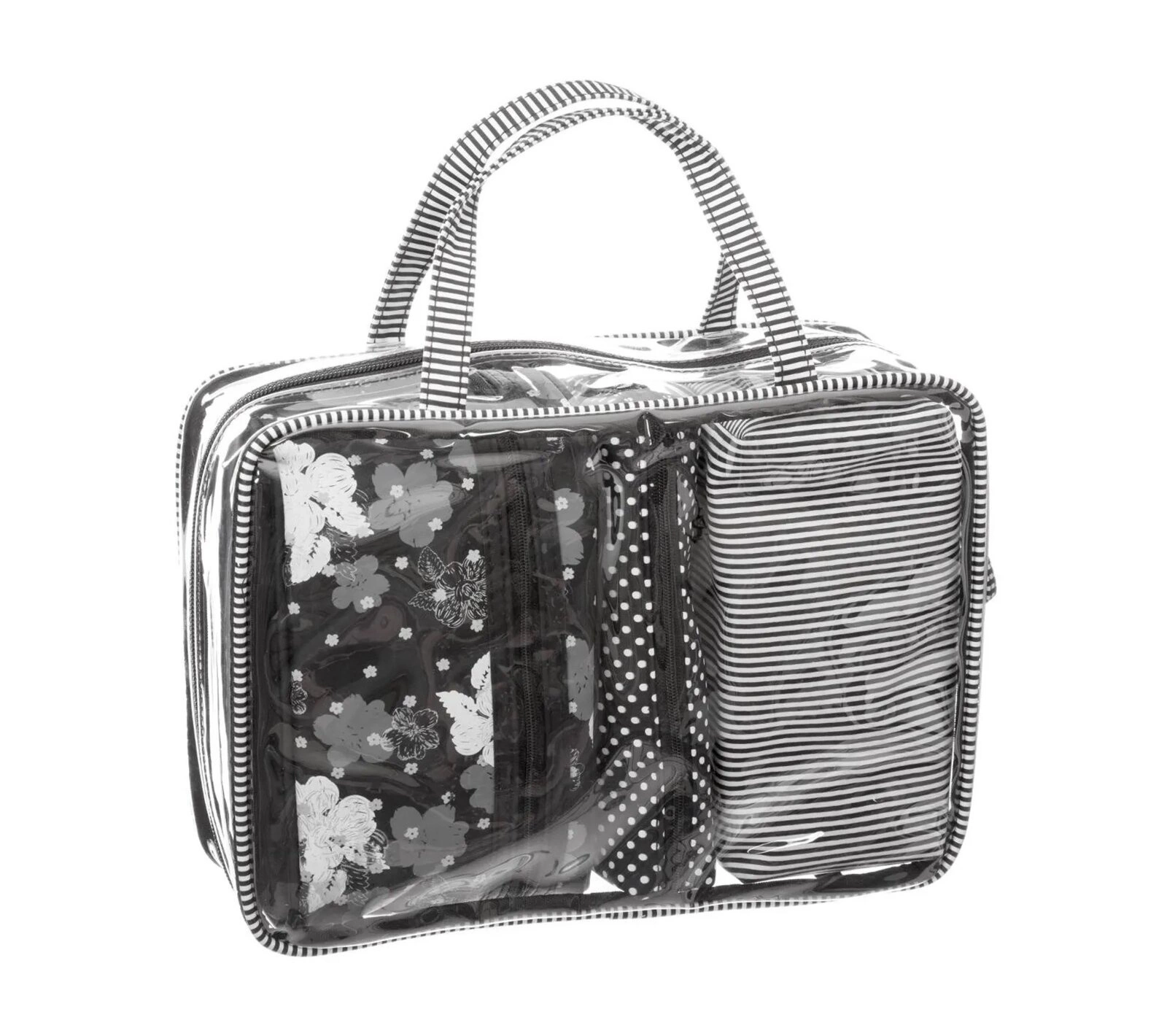Największa kosmetyczka ma wymiary 27 cm szerokości, 9 cm głębokości i 20 cm wysokości, co zapewnia dużo miejsca na przechowywanie. Pozostałe trzy kosmetyczki w zestawie mają bardziej kompaktowe rozmiary, idealne do uporządkowania mniejszych przedmiotów. Zestaw jest lekki (waży 0,149 kg), co czyni go wygodnym do przenoszenia w walizce czy torebce.