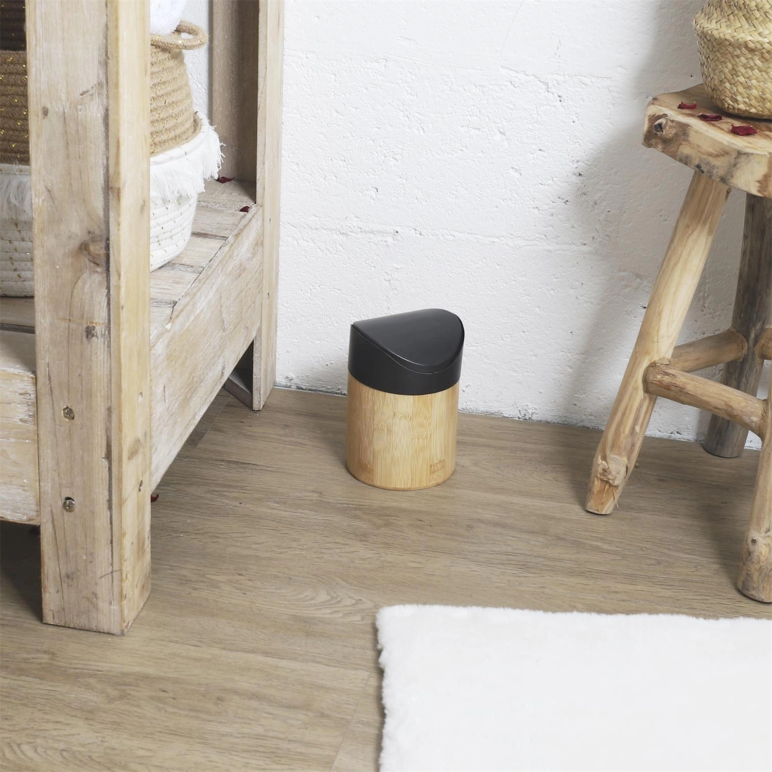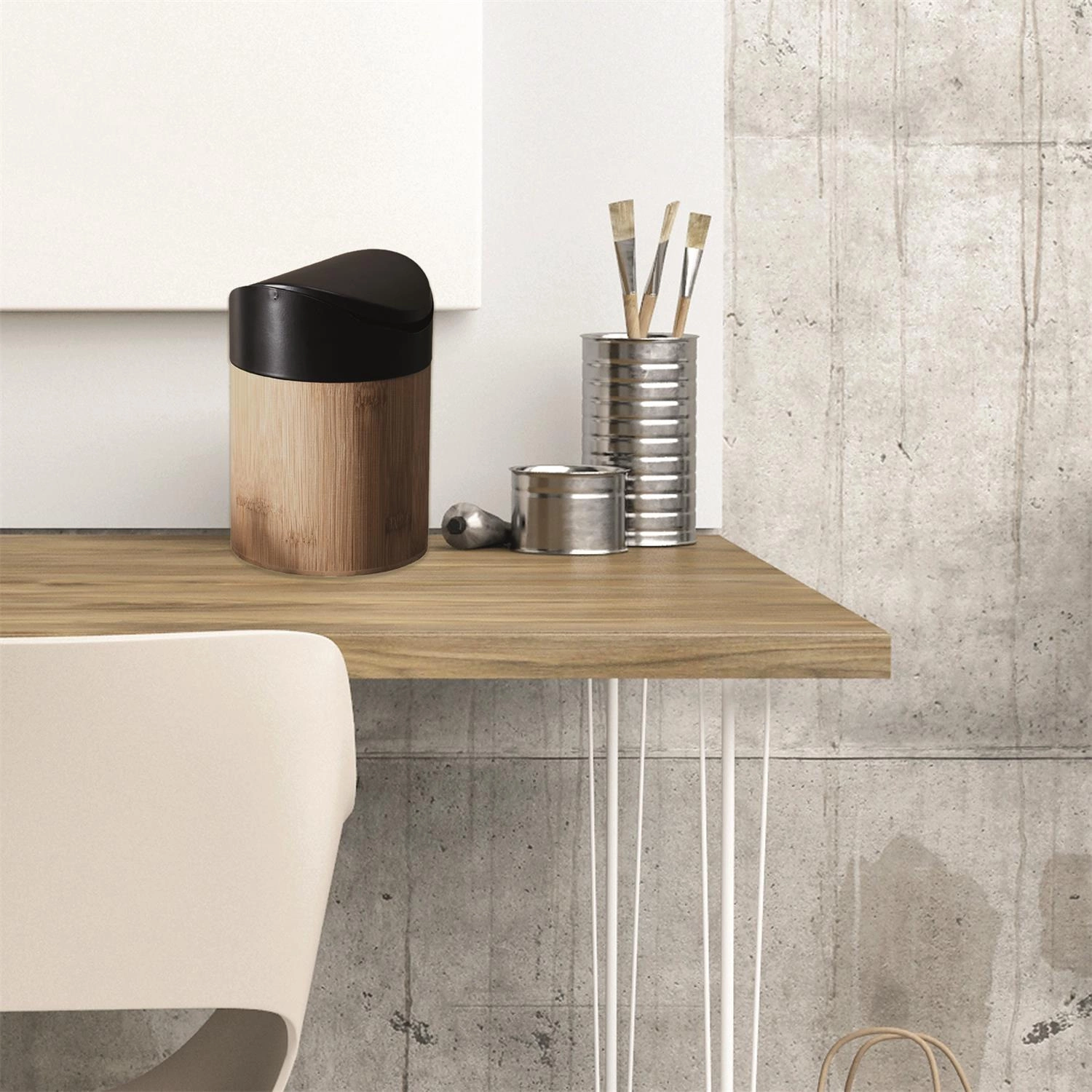 Mini kosz na śmieci Intesi Mini to połączenie naturalnego drewna bambusowego i eleganckiej czerni, zamknięte w minimalistycznej formie. Dzięki kompaktowym wymiarom (wysokość 17 cm, szerokość i głębokość 11,8 cm) oraz pojemności 1 litra doskonale sprawdzi się jako praktyczny pojemnik na śmieci do łazienki lub kuchni. Obrotowa pokrywa ułatwia codzienne użytkowanie i pozwala zachować higienę w każdym wnętrzu.