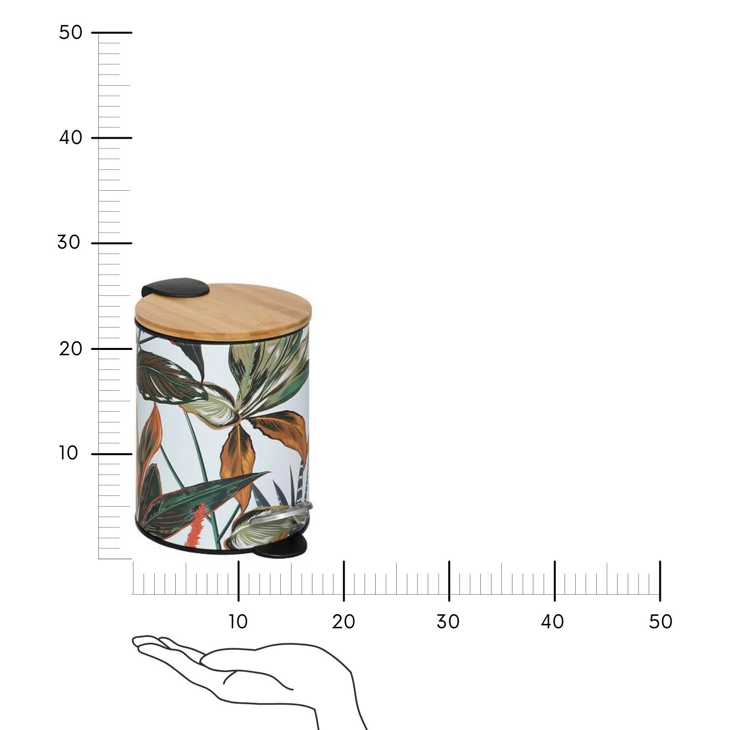 Kosz na śmieci BlackFlora marki 5five simply smart to nowoczesny pojemnik o pojemności 3 litrów, wykonany z wytrzymałego metalu, z dodatkiem drewna bambusowego oraz elementów z polipropylenu. Okrągły kształt, multikolorowa stylistyka oraz funkcja płynnego, cichego domykania (soft close) sprawiają, że to idealny wybór zarówno do łazienki, jak i do kuchni. Praktyczne wymiary – wysokość 25,5 cm oraz średnica 17 cm – czynią z niego kompaktowy kosz na śmieci, który zmieści się nawet w niewielkiej przestrzeni.