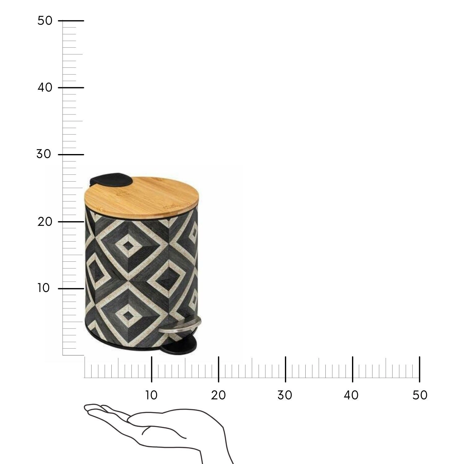 Kosz na śmieci do łazienki Canvas 3L marki 5five simply smart to praktyczne i estetyczne rozwiązanie do nowoczesnych wnętrz. Wykonany z trwałego metalu w połączeniu z detalami z drewna bambusowego, łączy w sobie funkcjonalność z modnym designem. Kompaktowe wymiary (wysokość 23 cm, szerokość 22,5 cm, głębokość 17 cm) sprawiają, że idealnie sprawdzi się jako kosz łazienkowy – nie zajmuje wiele miejsca, a jednocześnie dyskretnie pomaga utrzymać porządek.