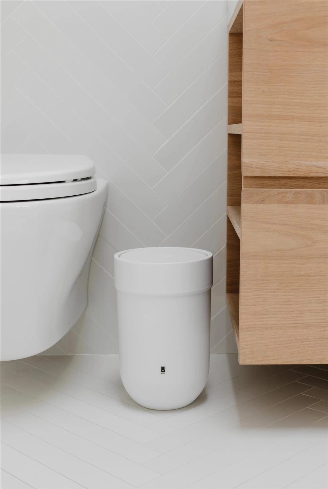 Minimalistyczna forma i biały kolor sprawiają, że kosz Umbra Touch doskonale wpisuje się w łazienki urządzone w stylu nowoczesnym, skandynawskim lub minimalistycznym. Dyskretna pokrywa pozwala szybko i skutecznie ukryć zawartość, dzięki czemu łazienka zawsze prezentuje się schludnie. Matowa powierzchnia nie tylko wygląda elegancko, ale także ułatwia czyszczenie – wystarczy przetrzeć wilgotną ściereczką, by przywrócić mu świeżość.