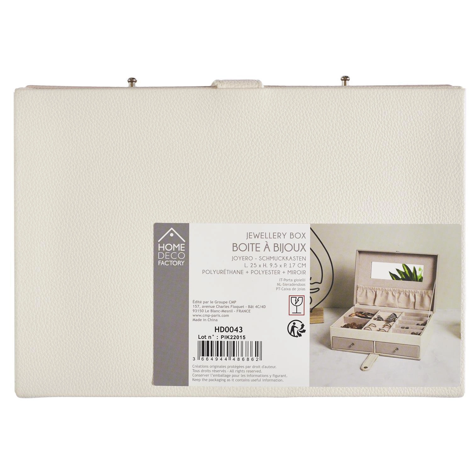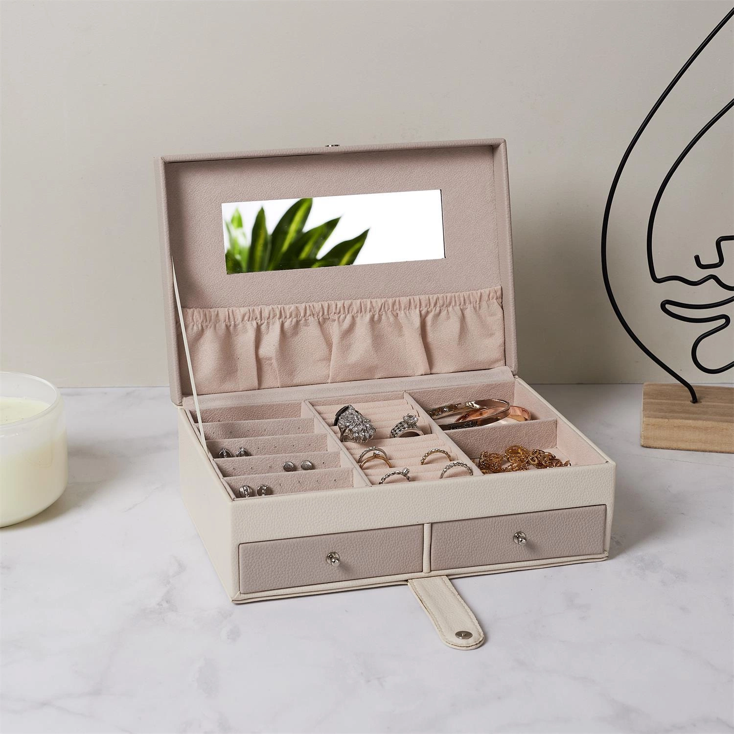 Organizer na biżuterię Lady Intesi kremowy z lusterkiem i szufladkami to wyjątkowo eleganckie i praktyczne rozwiązanie do przechowywania biżuterii i drobnych akcesoriów. Wykonany z miękkiej, welurowej tkaniny w odcieniu kremowym, wyposażony w dwa pojemne schowki i wbudowane lusterko, pozwala w wygodny i bezpieczny sposób zorganizować ulubione ozdoby. Kompaktowe wymiary 25×17×9,5 cm sprawiają, że organizer z łatwością zmieści się zarówno na toaletce w sypialni, jak i na półce w łazience.