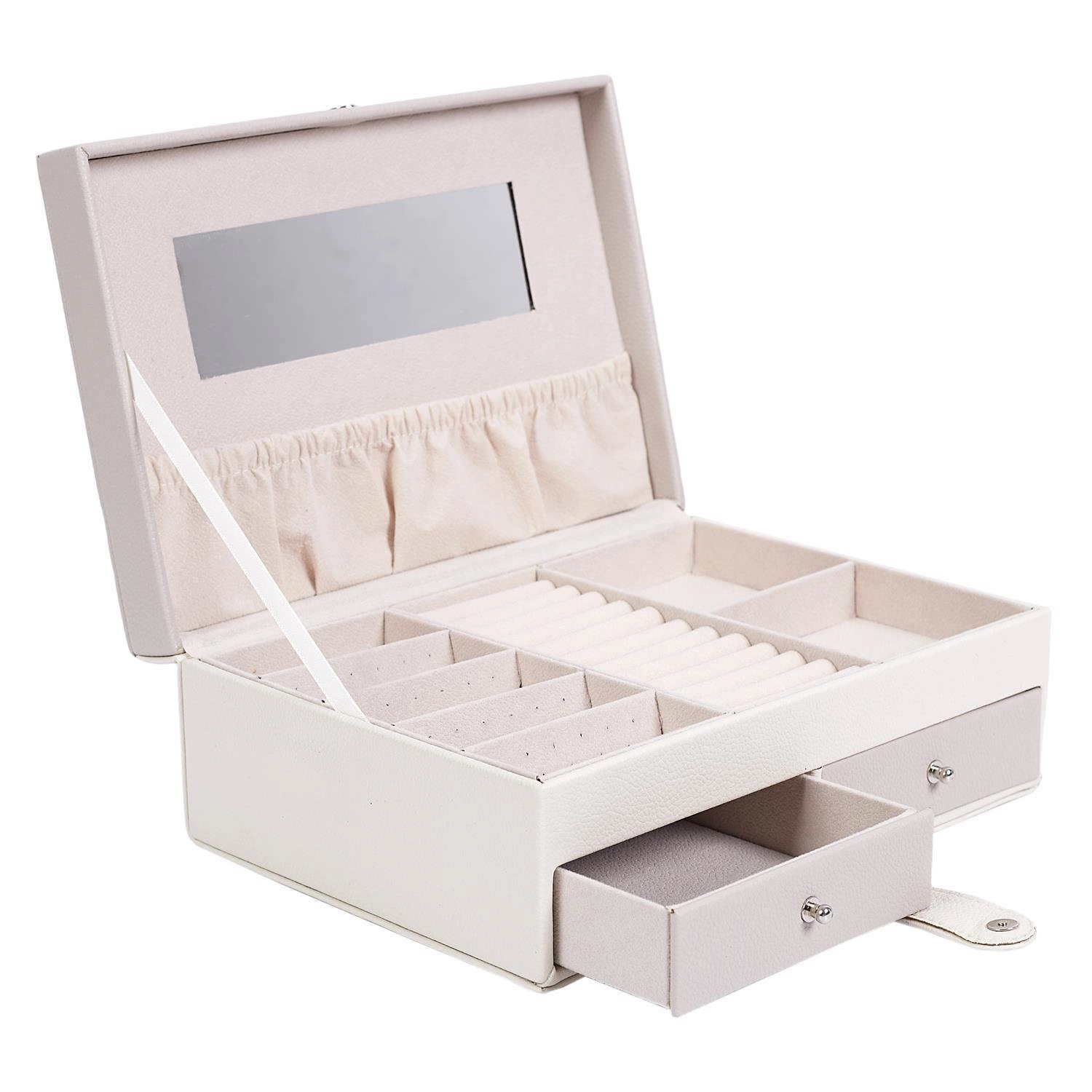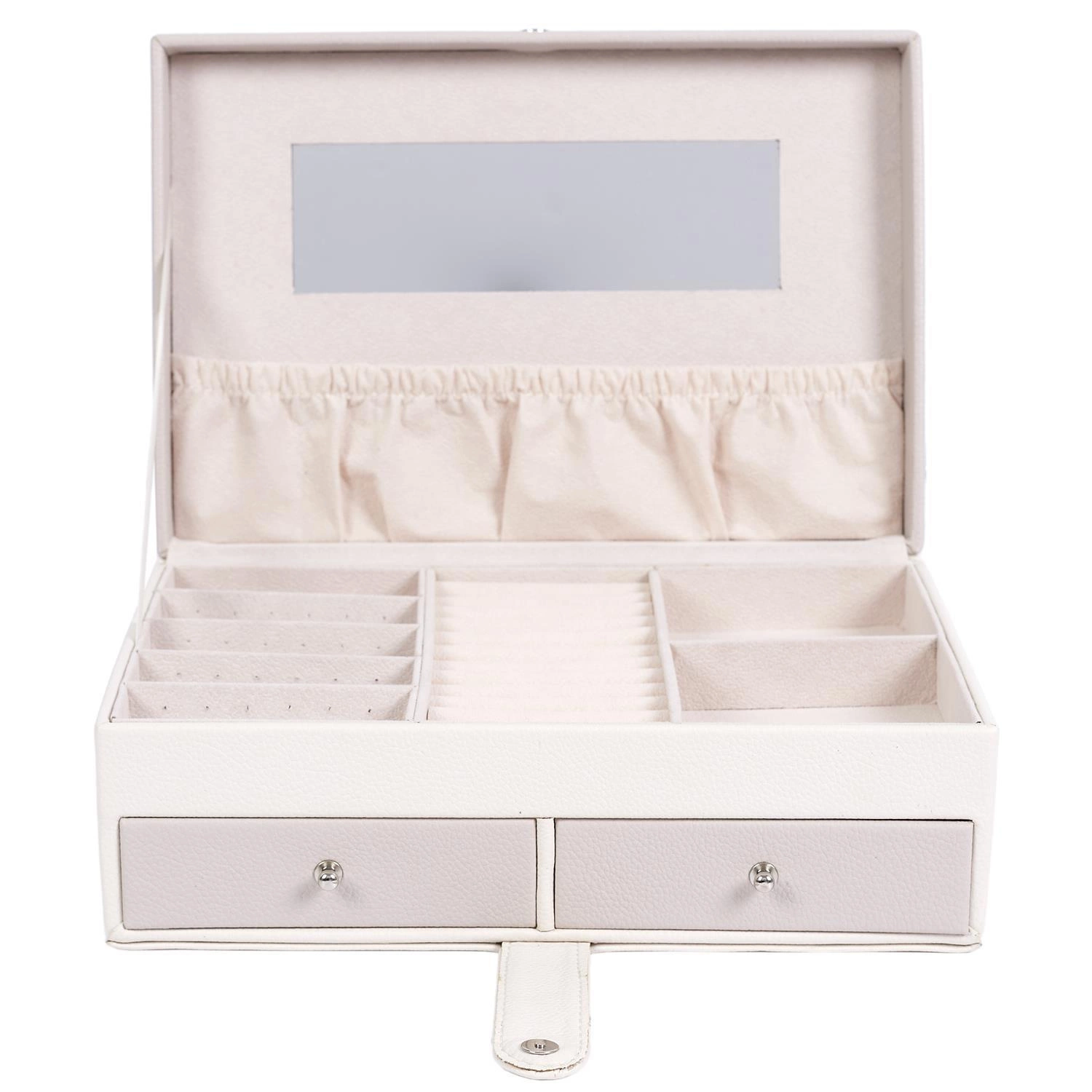Dzięki przemyślanemu układowi przegródek i dwóch szufladek, organizer na biżuterię Lady Intesi pozwala wygodnie posegregować różnorodne ozdoby. Specjalne miejsce na pierścionki, wydzielone przegródki na kolczyki i bransoletki oraz dodatkowe schowki na drobiazgi zapewniają pełną kontrolę nad porządkiem. Wbudowane lusterko ułatwia szybkie przymierzanie i komponowanie dodatków, a przyjemna w dotyku welurowa wyściółka chroni każdą sztukę biżuterii przed uszkodzeniami.