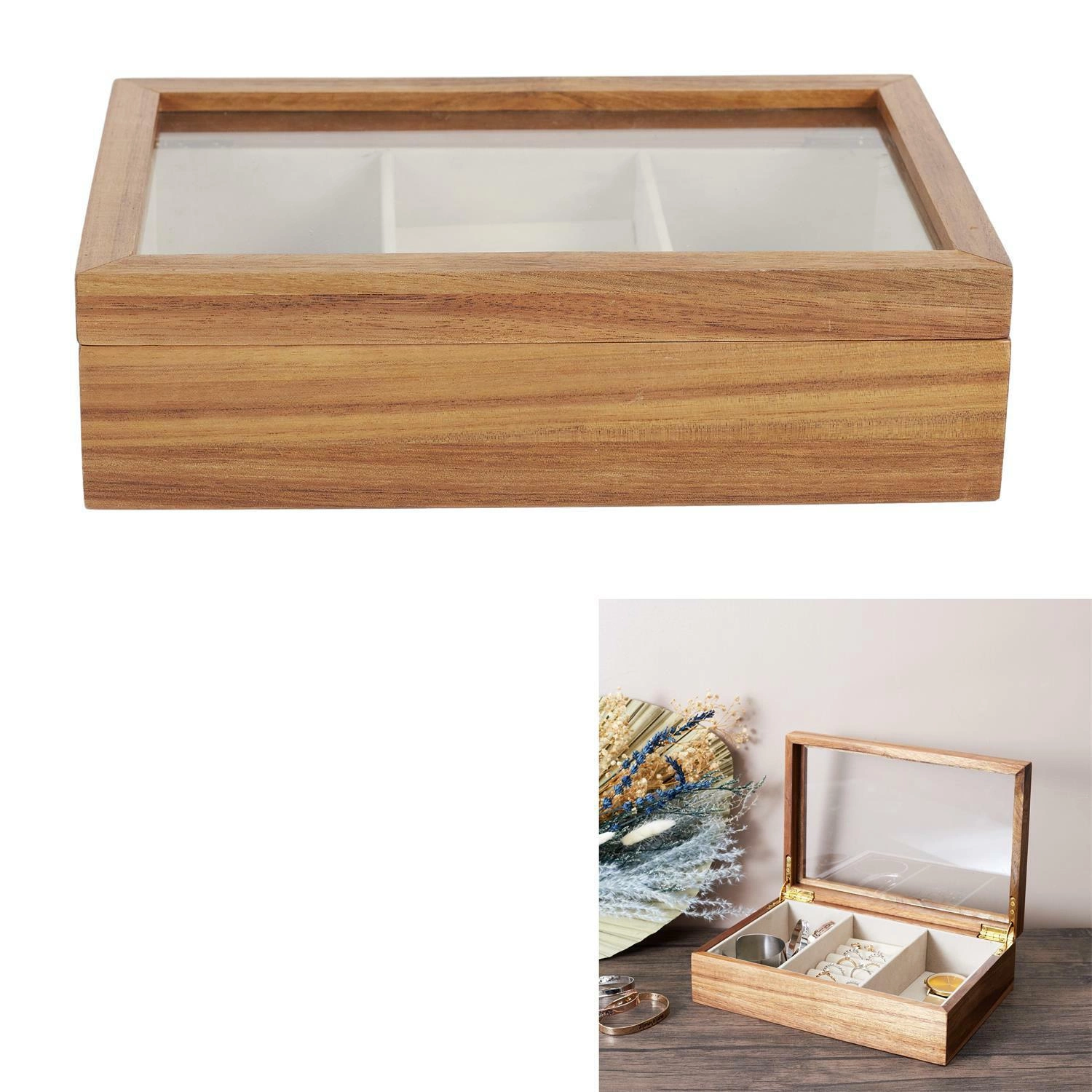 Ta wspaniała drewniana szkatułka wykonana jest z drewna akacjowego i posiada trzysekcyjną konstrukcję, która zapewnia dużo miejsca do przechowywania biżuterii. Pierwsza sekcja ma przegródki wyściełane tkaniną zaprojektowane tak, aby bezpiecznie trzymać pierścionki. Boczne są idealne do przechowywania kolczyków lub bransoletek.