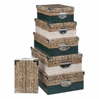 Zestaw 6 pudełek dekoracyjnych kartonowych 5five simply smart to praktyczne i stylowe rozwiązanie do przechowywania, które idealnie wpisuje się w nowoczesne wnętrza. Wykonane z solidnej tektury i wyposażone w metalowe okucia, pudełka w naturalnych i zielonych odcieniach ułatwiają organizację przestrzeni w domu, biurze czy pokoju dziecięcym. Różnorodność rozmiarów – od 28 x 19,5 x 10,8 cm do 48 x 33,5 x 16 cm – sprawia, że bez trudu przechowasz zarówno drobiazgi, jak i większe przedmioty.