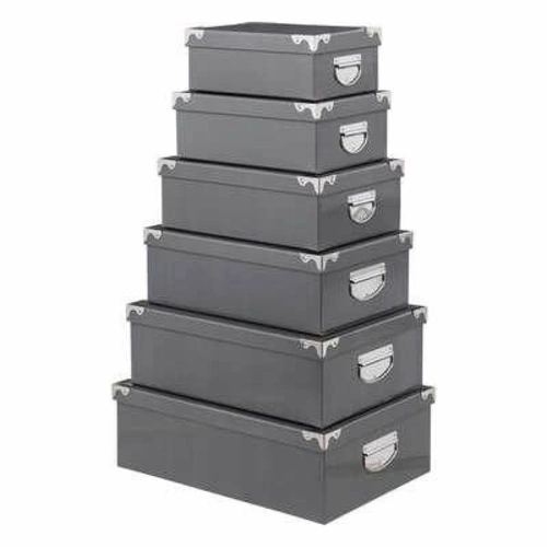 Zestaw 6 szarych pudełek ozdobnych kartonowych 5five simply smart to praktyczne i stylowe rozwiązanie do przechowywania niezbędnych drobiazgów w biurze, pokoju czy domowej pracowni. Wykonane z wytrzymałego kartonu, z metalowymi elementami dla zwiększonej trwałości, pozwalają zadbać o porządek w nowoczesnym wnętrzu. Największe pudełko ma imponujące wymiary 48 cm szerokości, 33,5 cm głębokości i 16 cm wysokości, co zapewnia dużą pojemność i swobodę aranżacji przestrzeni.