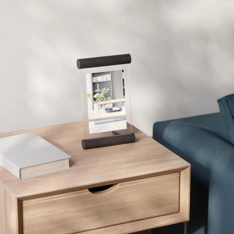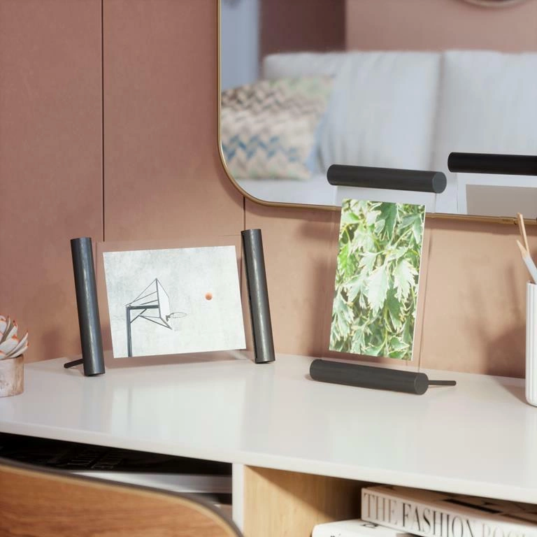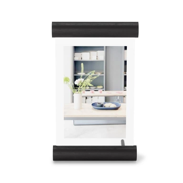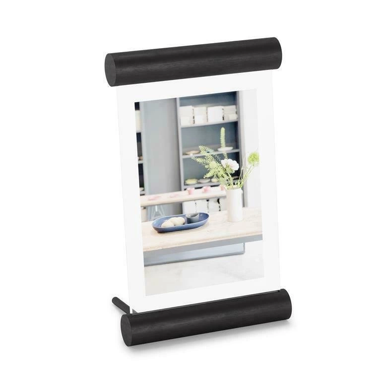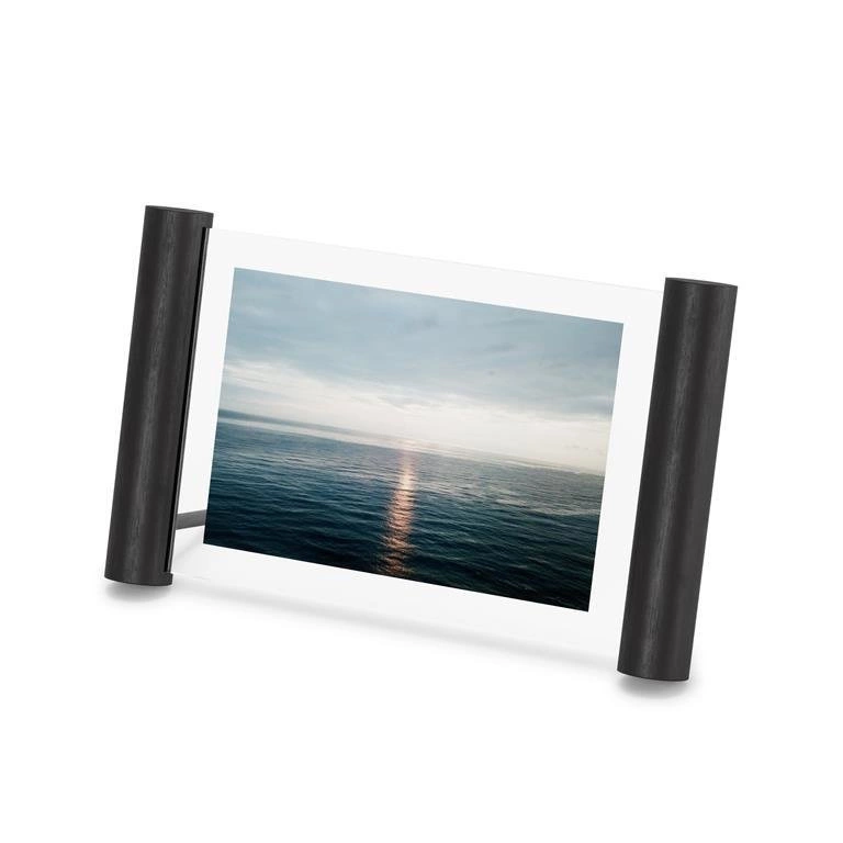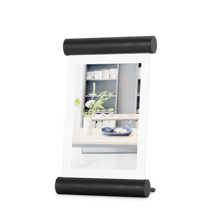 Szukasz nietypowej oprawy swoich zdjęć? Spodoba Ci się ramka na zdjęcia Scroll! Jest to wyjątkowo piękne połączenie dwóch szlachetnych materiałów — szkła i drewna. Pozbawiona zbędnych dekoracji zachwyca swoim minimalistycznym designem i elegancją. Dzięki niej w estetyczny sposób zaprezentujesz i oprawisz swoje ulubione uwiecznione wspomnienia. Ramka będzie też fantastycznym elementem dekoracyjnym, do którego możesz włożyć zasuszone kwiaty lub karteczki z cytatami, czyli wszystko, co chcesz uwiecznić. Wykonana z wytrzymałego szkła i drewnianych wałeczków w czarnej barwie będzie wyglądać pięknie na szafce nocnej lub biurku.