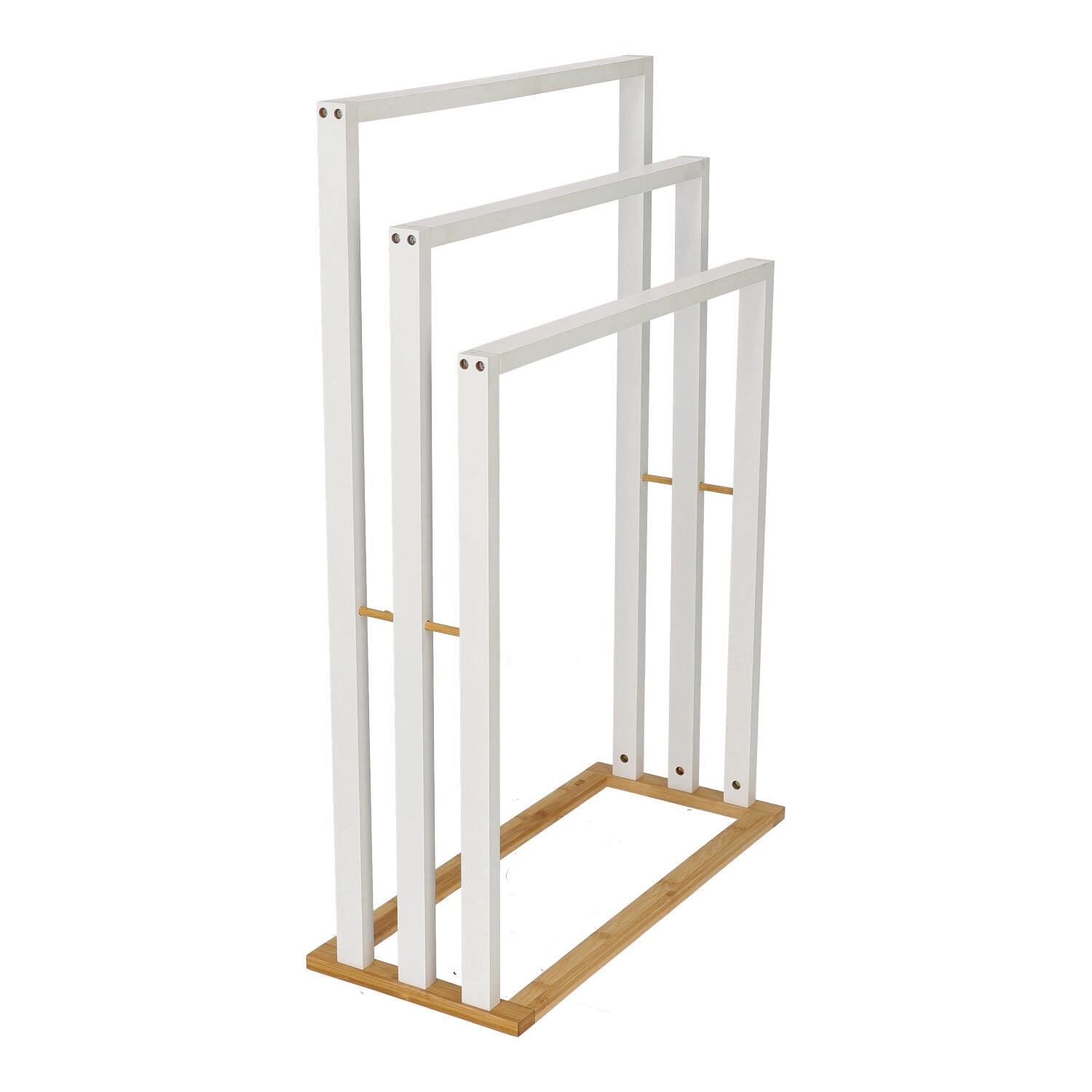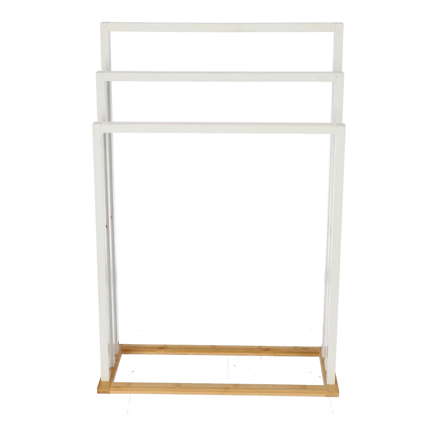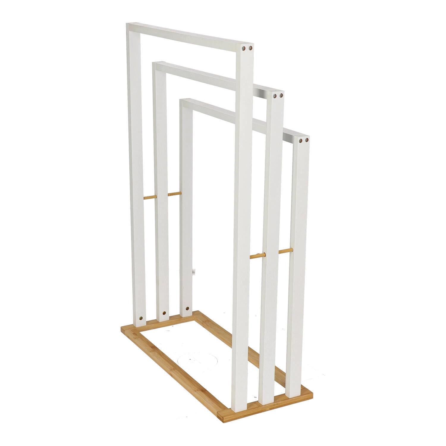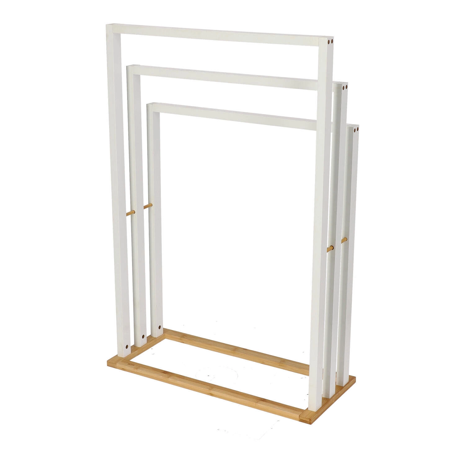 Stojący wieszak łazienkowy na ręczniki 5five simply smart boho to połączenie funkcjonalności, naturalnych materiałów i stylowego designu. Został wykonany z solidnego drewna bambusowego oraz elementów w kolorze białym, co nadaje mu lekkości i świeżości. Dzięki trzem praktycznym ramionom zyskujesz wygodne miejsce na przechowywanie i suszenie ręczników. Kompaktowa forma (wysokość 82 cm, szerokość 55 cm, głębokość 24 cm) sprawia, że doskonale odnajdzie się nawet w mniejszych łazienkach.