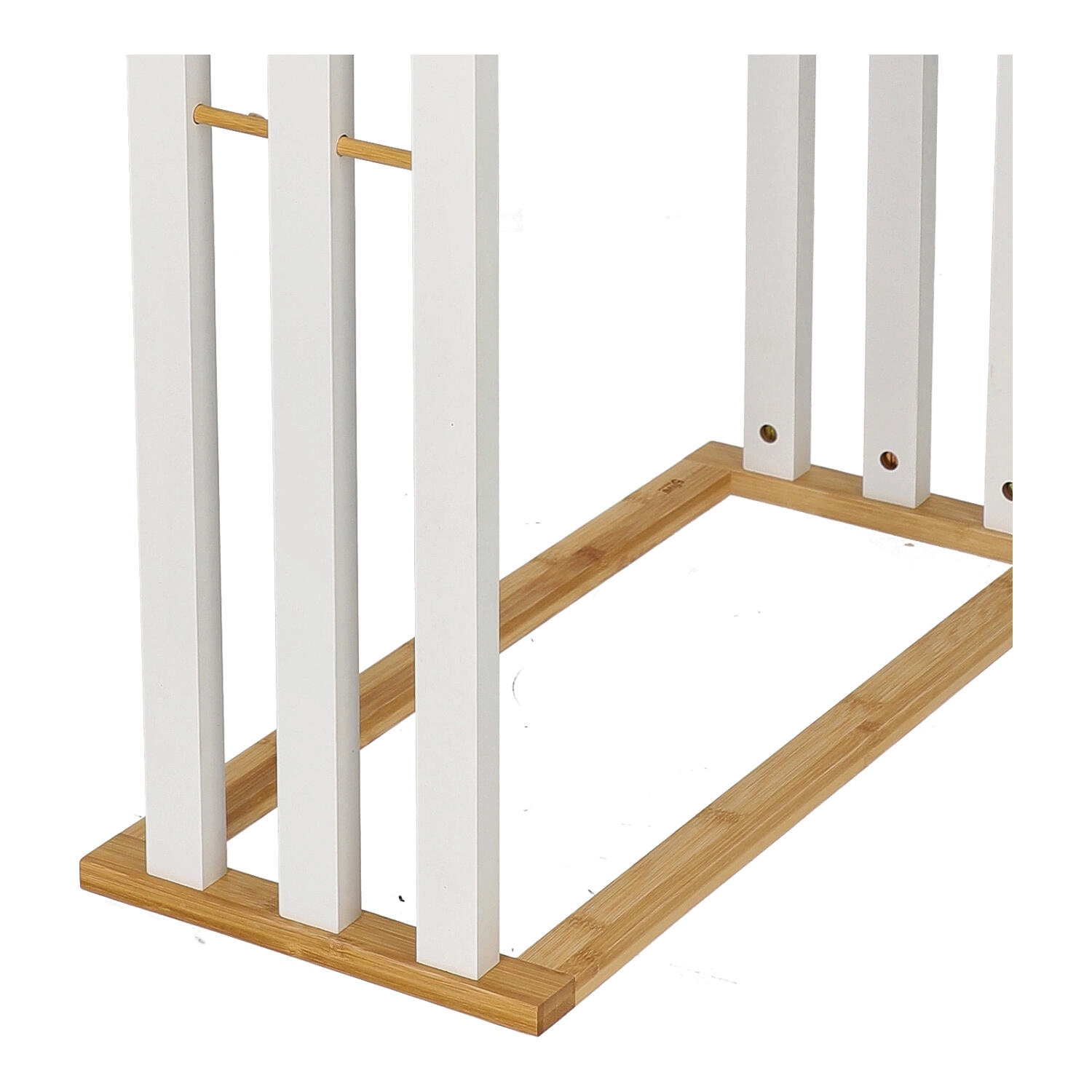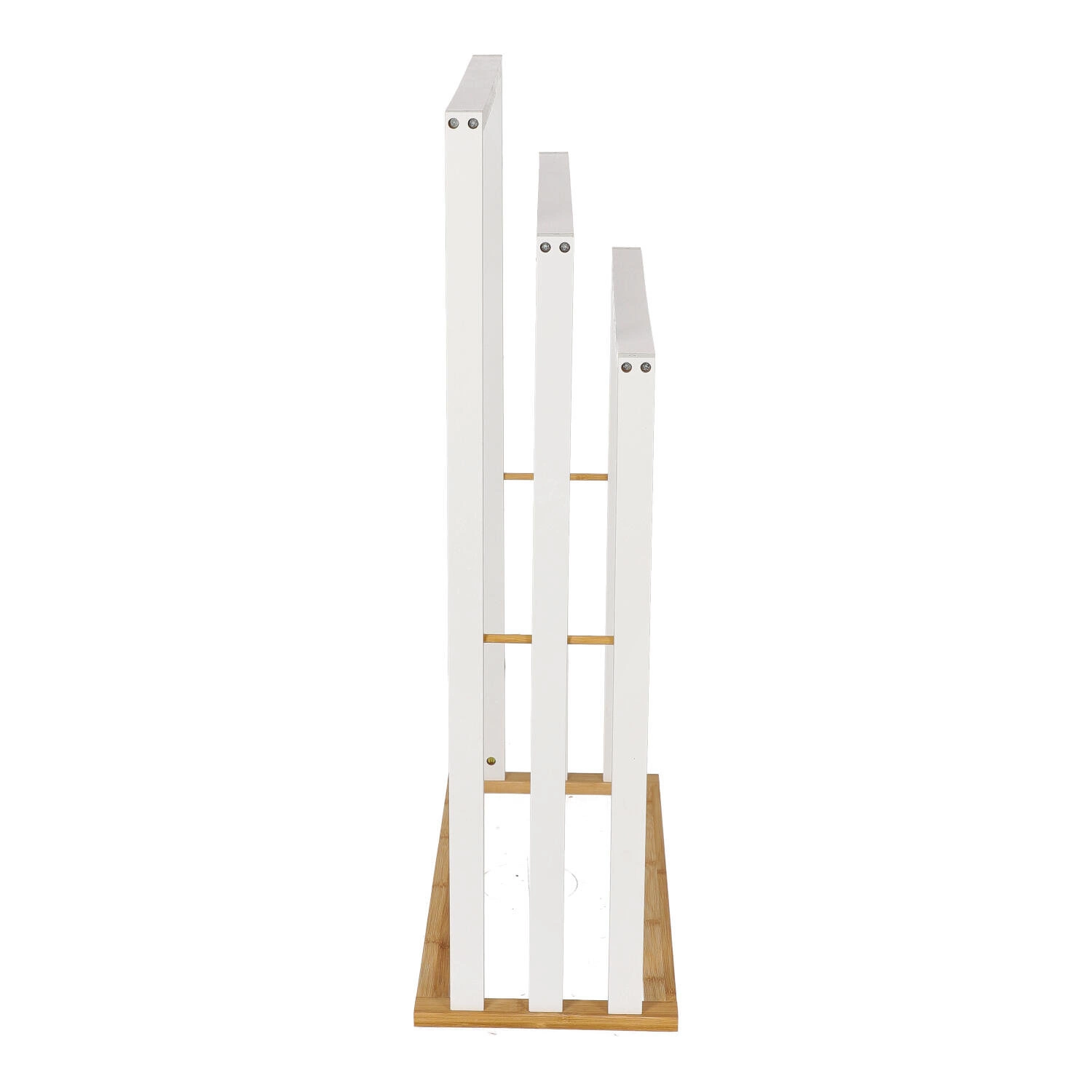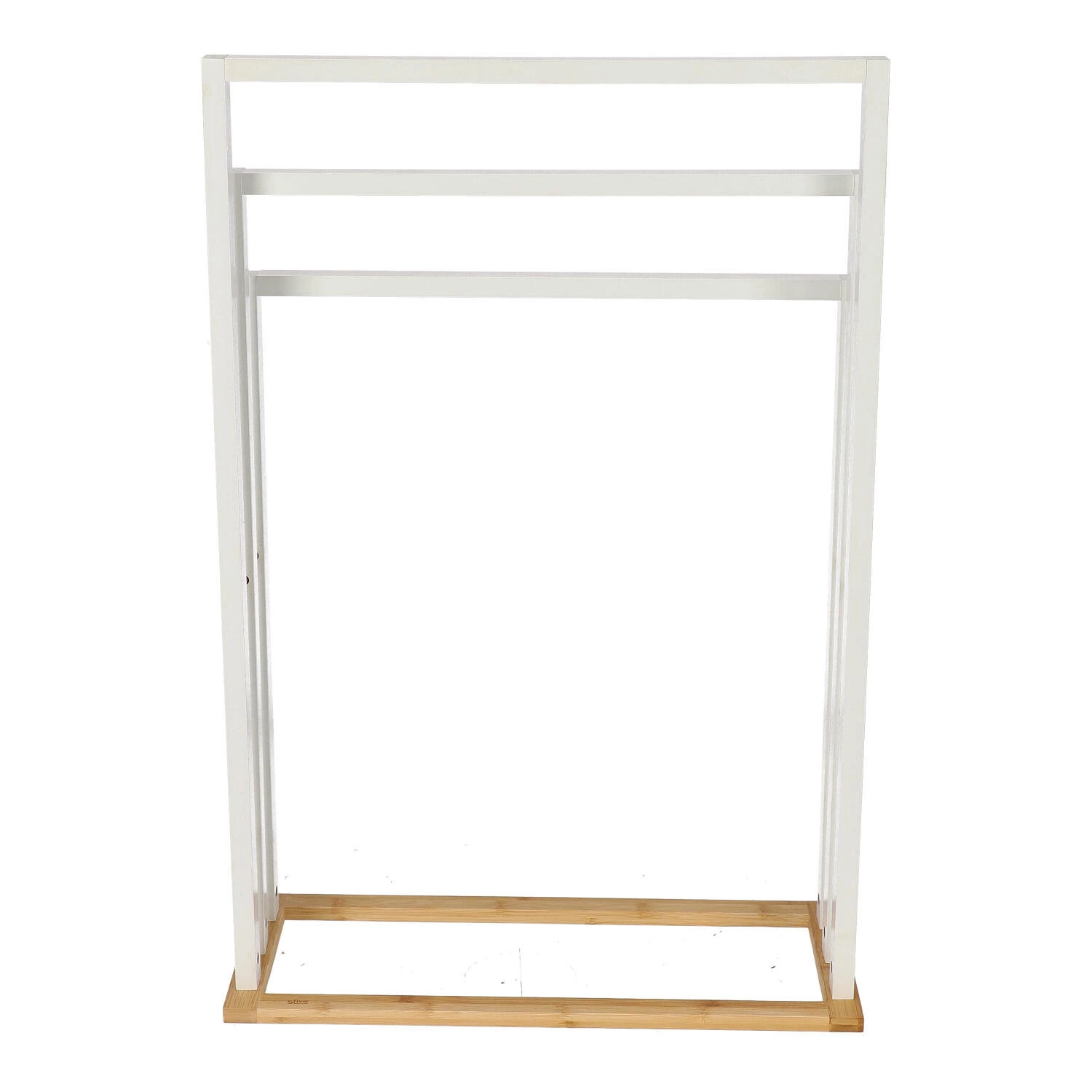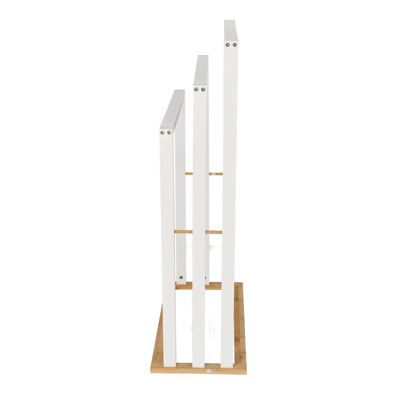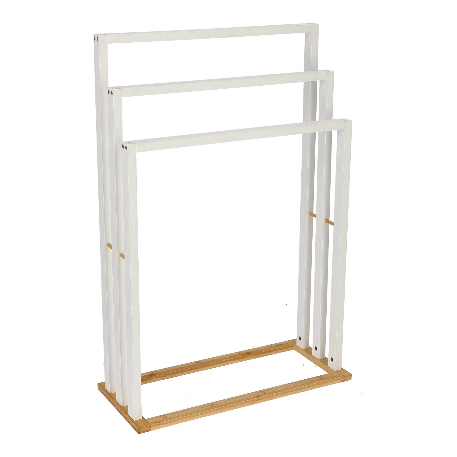 Stojący wieszak łazienkowy na ręczniki 5five simply smart boho to połączenie funkcjonalności, naturalnych materiałów i stylowego designu. Został wykonany z solidnego drewna bambusowego oraz elementów w kolorze białym, co nadaje mu lekkości i świeżości. Dzięki trzem praktycznym ramionom zyskujesz wygodne miejsce na przechowywanie i suszenie ręczników. Kompaktowa forma (wysokość 82 cm, szerokość 55 cm, głębokość 24 cm) sprawia, że doskonale odnajdzie się nawet w mniejszych łazienkach.
