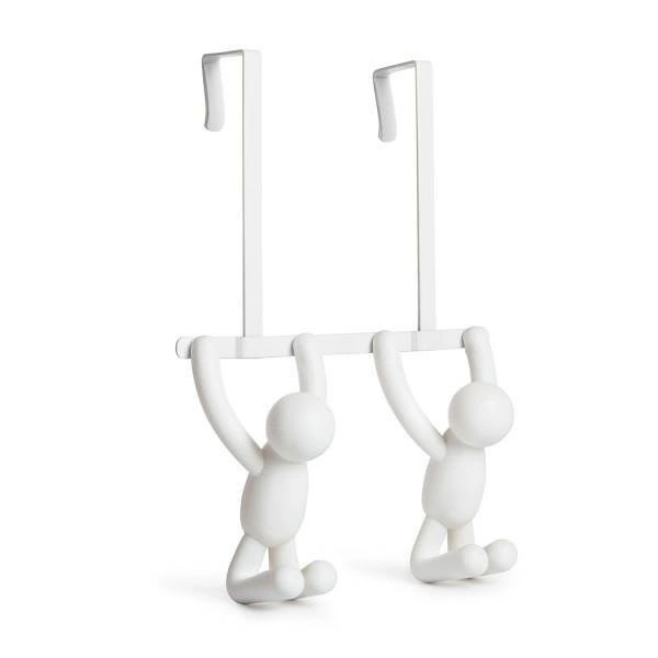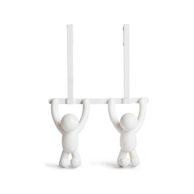 Wieszak na drzwi Umbra Buddy biały to designerski, nowoczesny akcent do Twojego przedpokoju lub łazienki, który łączy praktyczność z niebanalną formą. Wykonany z trwałego tworzywa i metalu, wykończony matowo, zapewnia stabilność i odporność na codzienne użytkowanie. Jego kompaktowe wymiary – wysokość 32 cm, szerokość 22 cm i głębokość 11 cm – sprawiają, że idealnie sprawdzi się nawet w niewielkiej przestrzeni. Dwa wyprofilowane uchwyty umożliwiają wygodne zawieszenie kurtek, torebek, szali czy ręczników bez konieczności wiercenia otworów w ścianie.