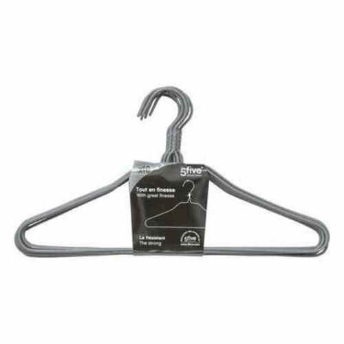 Zestaw 10 metalowych wieszaków na ubrania do szafy marki 5five simply smart to praktyczne i stylowe rozwiązanie do organizacji garderoby. Wykonane z solidnej stali, wieszaki w modnym szarym kolorze wyróżniają się nowoczesnym designem i smukłą formą o szerokości 39,5 cm oraz wysokości 21,5 cm. Dzięki minimalistycznej konstrukcji skutecznie pomagają uporządkować ubrania, oszczędzając miejsce w szafie i ułatwiając codzienne wybieranie stylizacji.