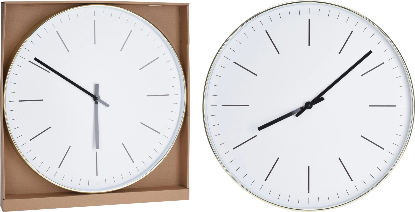 Okrągły, nowoczesny zegar ścienny Slimer jest nie tylko urządzeniem odmierzającym czas. Jest dopełnieniem każdej nowoczesnej aranżacji i minimalistyczną ozdobą ścienną, która upiększy ścianę w modnym mieszkaniu. Zegar wykonany został z estetycznego tworzywa, pokrytego lakierem w kolorze złotym. Połyskująca powierzchnia idealnie komponuje się ze wskazówkami w czarnym kolorze i białą gładką tarczą. Liczby określające godziny zastąpione zostały dłuższymi liniami, natomiast minuty — krótkimi, dzięki czemu dokładniej zweryfikujesz godzinę. Zegar ścienny Slimer nie posiada wskazówki sekundnika, a co za tym idzie, zegar nie wydaje odgłosu tykania. Możesz więc śmiało zastosować go w sypialni, domowym biurze czy salonie. Zegar dostępny jest w dwóch wariantach kolorystycznych, dzięki czemu z łatwością dostosujesz go do swojego wnętrza. Zegar napędzany jest 1 baterią AA (brak w zestawie).
