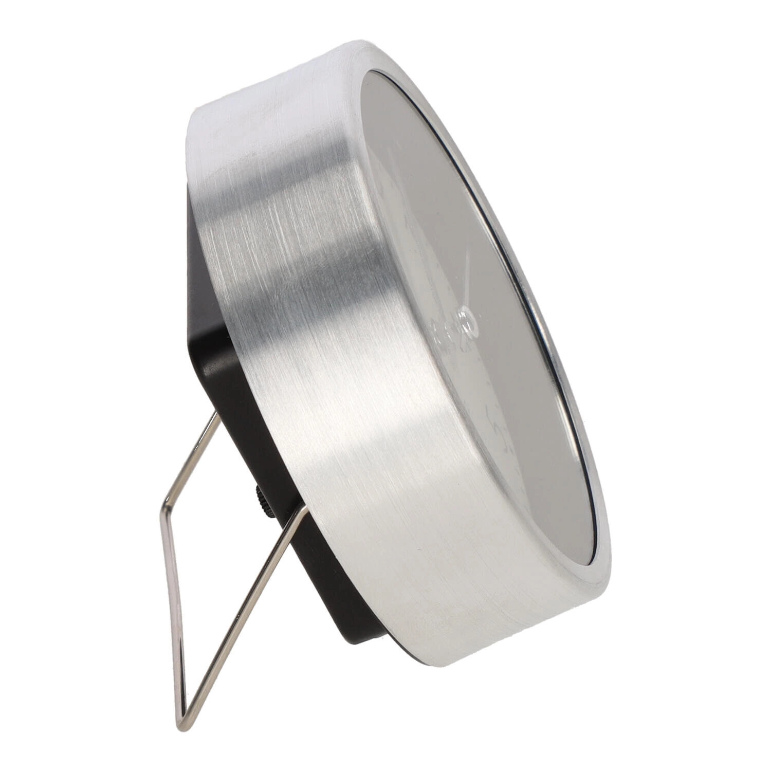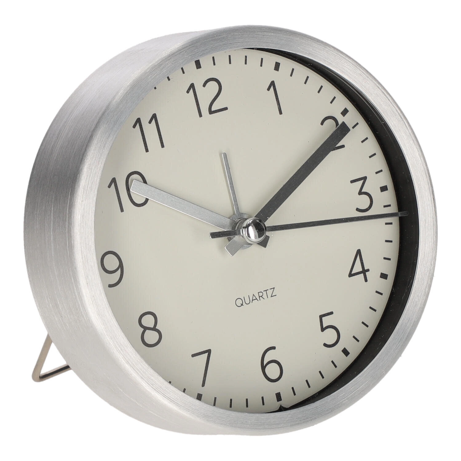 Budzik jest wykonany z wysokiej jakości aluminium, co gwarantuje jego solidność i trwałość. Metalowe wskazówki dodają mu elegancji i sprawiają, że będzie ozdobą na szafce nocnej lub biurku. Biała, okrągła tarcza zapewnia łatwe odczytanie czasu.