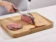 Deska bambusowa Joseph Joseph Cut&Carve została zaprojektowana z myślą o wszechstronnym użytkowaniu. Z jednej strony znajdziesz powierzchnię gładką, idealną do krojenia pieczywa, warzyw czy owoców, natomiast druga strona wyposażona jest w praktyczny rant z rowkiem, który skutecznie zatrzymuje soki z mięsa czy owoców, zapobiegając rozlewaniu się płynów na blat. Dzięki temu możesz komfortowo i higienicznie przygotowywać różnorodne produkty, zachowując porządek w kuchni.