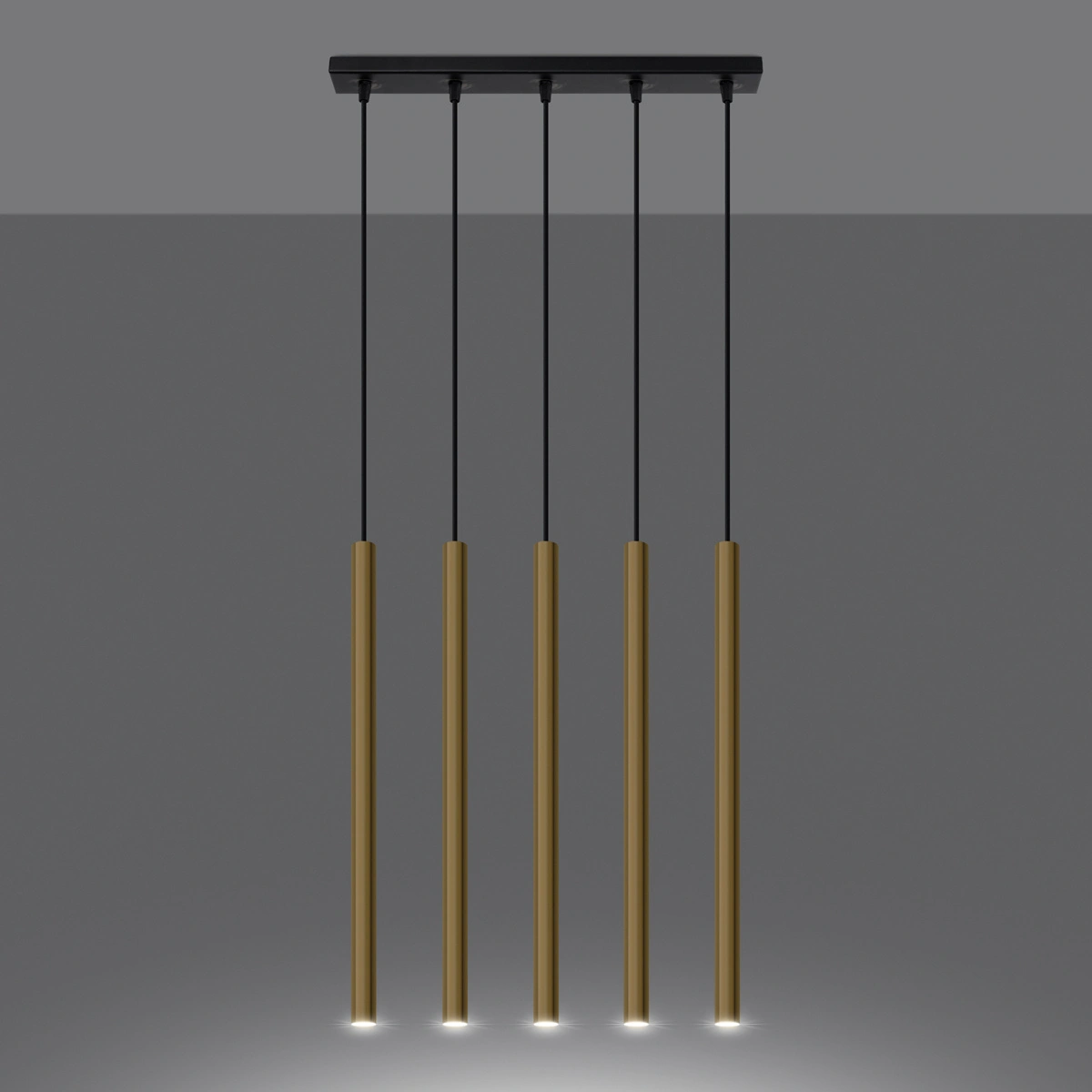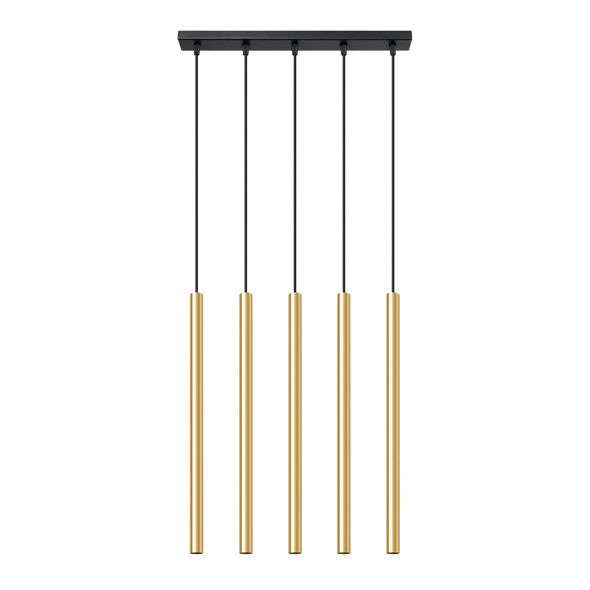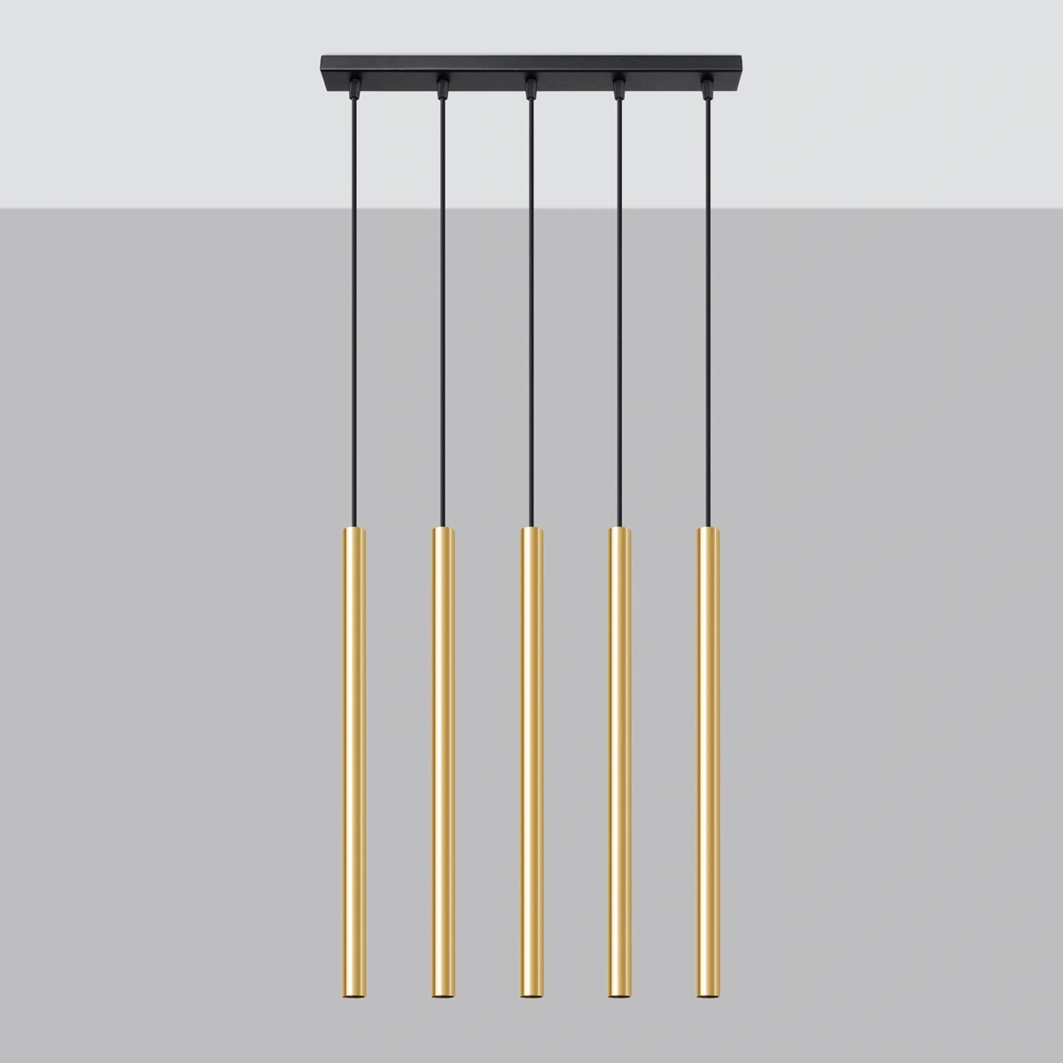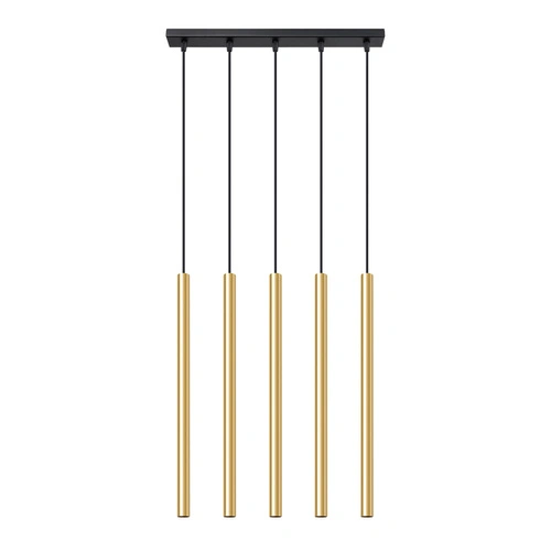 Lampa sufitowa Pastelo 5L w eleganckim, złotym wykończeniu to propozycja dla osób ceniących ponadczasowy styl i nutę luksusu. Jej minimalistyczna, linearna forma pięknie prezentuje się w nowoczesnych aranżacjach, stając się subtelną, a zarazem wyrazistą ozdobą. Metalowa konstrukcja gwarantuje trwałość i stabilność, a czarne detale (kabel i podsufitka) wprowadzają modny kontrast, który dopełni zarówno jasne, jak i ciemniejsze wnętrza.