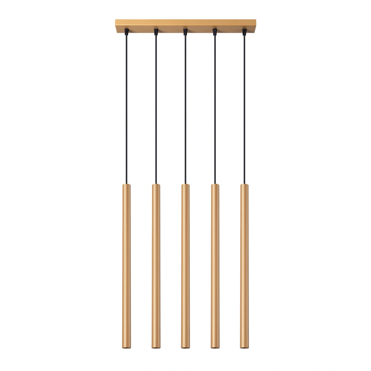 Lampa sufitowa Pastelo 5-punktowa zachwyca prostą, geometryczną formą oraz modnym złotym wykończeniem, które subtelnie podkreśla charakter każdego nowoczesnego wnętrza. Złota powierzchnia nie tylko przyciąga wzrok, ale także efektownie odbija światło, wprowadzając do pomieszczenia ciepło i elegancję. To idealny żyrandol do salonu, który stanie się oryginalną ozdobą nad stołem w jadalni lub stylową lampą nad wyspę kuchenną.