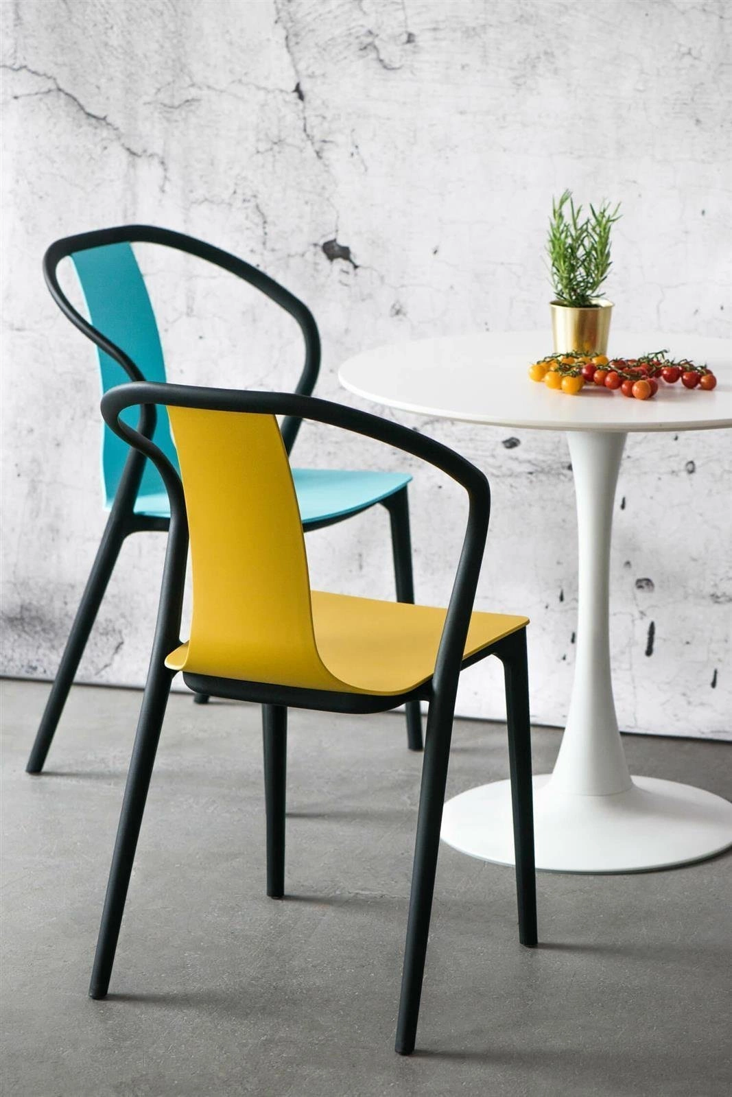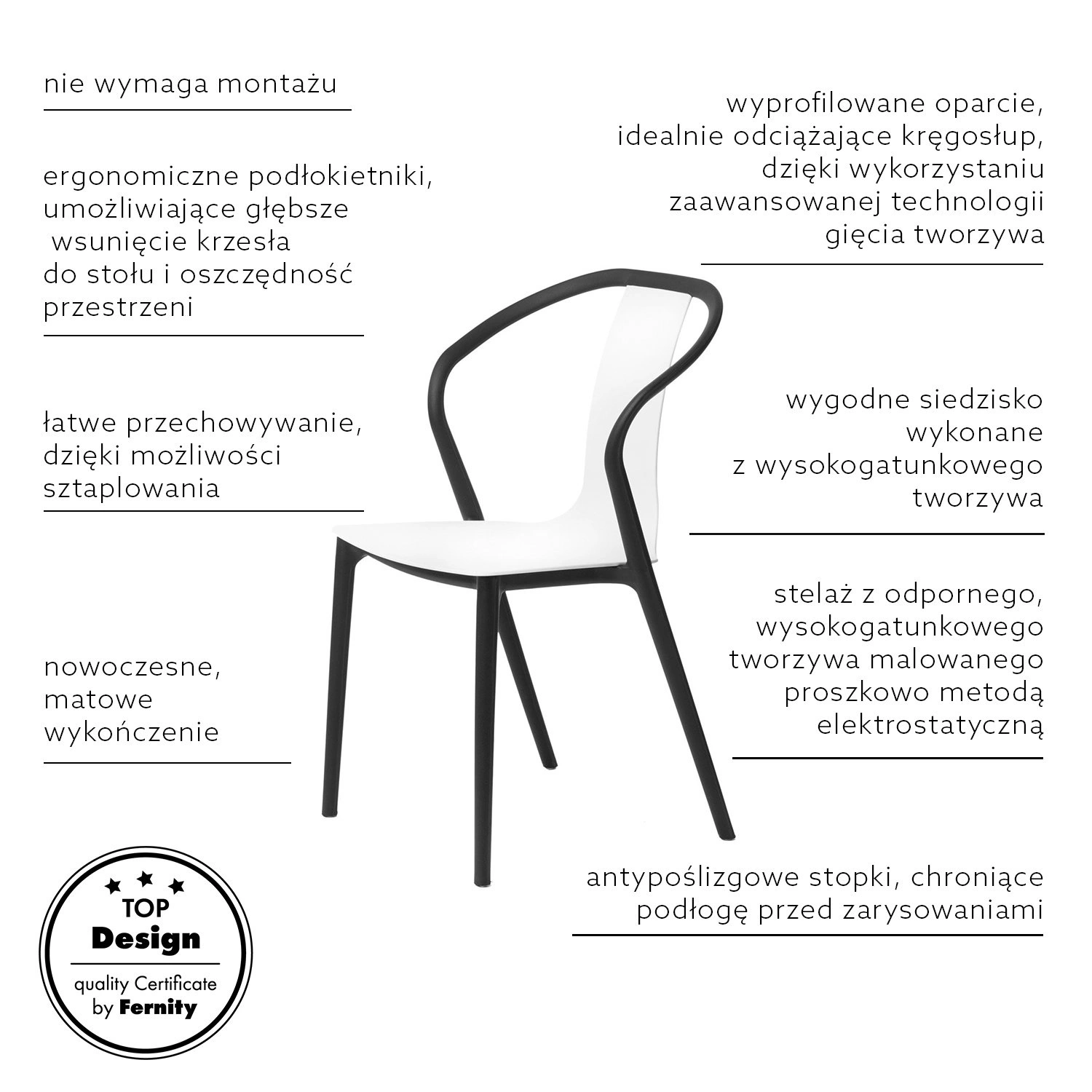 Krzesło Bella zostało stworzone z połączenia czarnego oraz białego polipropylenu. Matowy polipropylen wykończony w półmacie jest idealnym materiałem do użytku w krzesłach w jadalni oraz w kuchni. Stopki krzesła zakończone są miękkimi, gumowymi podkładkami, aby nie uszkadzały podłogi.