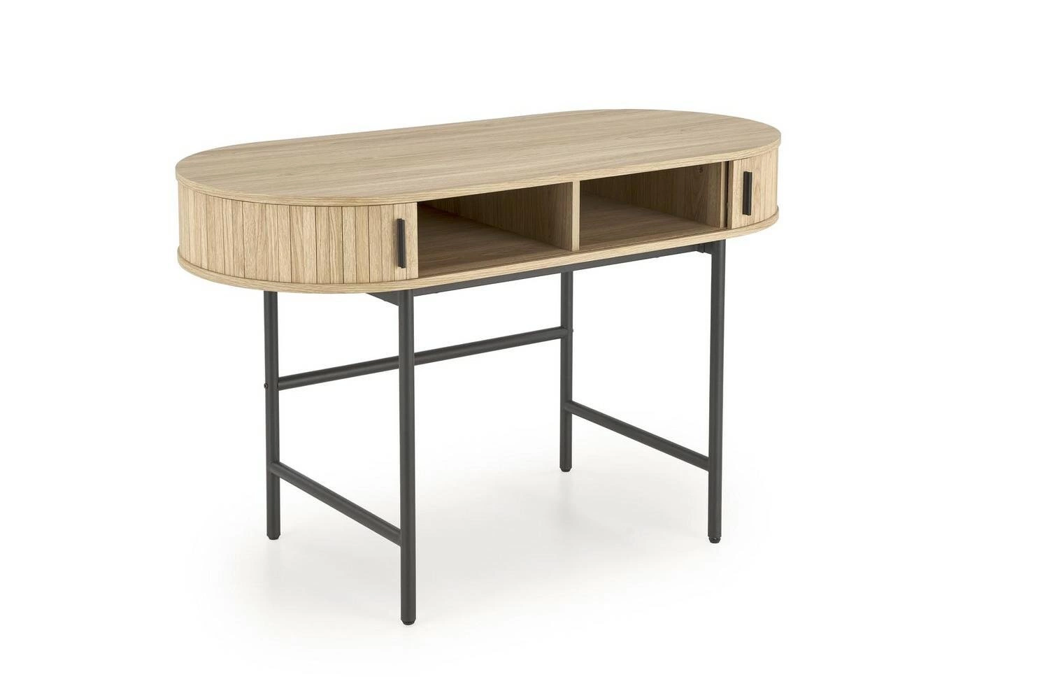 Biurko Bahli w naturalnym wykończeniu z czarnymi nogami to elegancki i funkcjonalny mebel, który doskonale wpisuje się w nowoczesne wnętrza. Charakteryzuje się solidną konstrukcją wykonaną z MDF okleinowanego, co zapewnia estetyczny wygląd oraz trwałość. Stal malowana proszkowo nadaje mu stabilność i odporność na uszkodzenia mechaniczne.