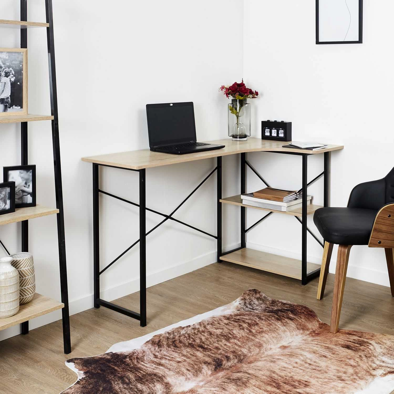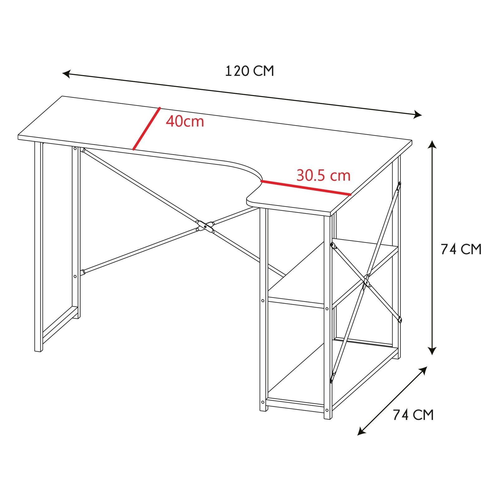 BIURKO NAROŻNE STAND to mebel dla osób ceniących sobie zorganizowane miejsce pracy. Pozwala ono lepiej wykorzystać przestrzeń, tym samym nie zajmując zbyt wiele miejsca w pokoju. Blat biurka w kształcie litery L bez problemu zmieści komputer czy laptop, natomiast dwie dodatkowe półki zapewnią miejsce na książki czy segregatory. Dodatkowo zaokrąglony róg od wewnątrz zapewnia wygodne oparcie dla rąk podczas siedzenia przy biurku. Blat oraz półki z laminowanej drewnopodobną okleiną płyty MDF usytuowane zostały na metalowej podstawie. Jej nowoczesny kształt w połączeniu ze stylowymi wspornikami sprawia, że biurko jest industrialne i pasować będzie do wnętrz loft, a także scandi. Stand to idealne biurko narożne do gabinetu, domowego biura, jak i pokoju młodzieżowego.