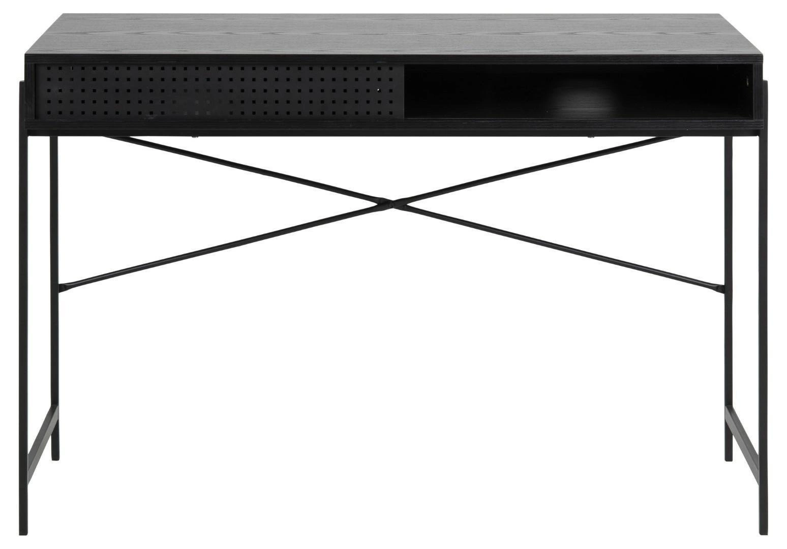 Styl industrialny wciąż jest jednym z najbardziej popularnych aranżacji w ostatnim czasie. Jego surowość, estetyka i ergonomia to cechy, które w połączeniu z niepowtarzalnym wyposażeniem tworzą wyjątkowy klimat, jaki uwielbiamy. Duch fabryki zamknięty w minimalistycznych meblach o uwydatnionej konstrukcji to obowiązkowy element takiej przestrzeni. Kolekcja Angus producenta Actona to meble, które w subtelny i nieprzesadzony sposób podkreślą charakter industrialny każdego mieszkania. ANGUS to kompaktowe biurko, które może być idealnym meblem do biura lub pokoju nastolatka. Blat o głębokości 50 cm zrobiony został z płyty MDF w czarnej okleinie imitującej jesionowe drewno. Pod blatem znajduje się ukryta półka, którą osłania ażurowy, przesuwny front wykonany z tego samego materiału. Skrzynia opiera się na metalowej delikatnej konstrukcji malowanej proszkowo na czarno, która sprawia, że biurko wydaje się być drobne i lekkie, a tym samym estetycznie wygląda we wnętrzu. Dodatkowe, krzyżujące się wsporniki są nie tylko swoistą ozdobą, ale również stabilizują mebel. Typowo industrialne połączenie faktur i materiałów świetnie wpisze się w przestrzeń domowego biura, pokoju nastolatka lub kreatywnego gabinetu. Aby ujednolicić swoje wnętrze, wykorzystaj także inne meble z wyjątkowej kolekcji Angus.
