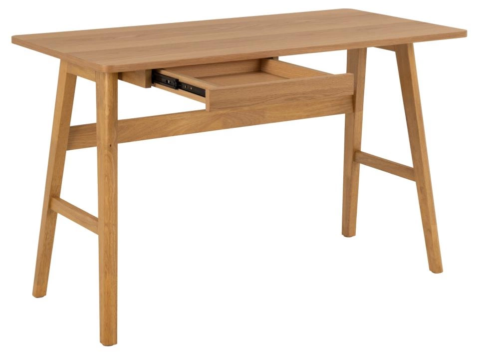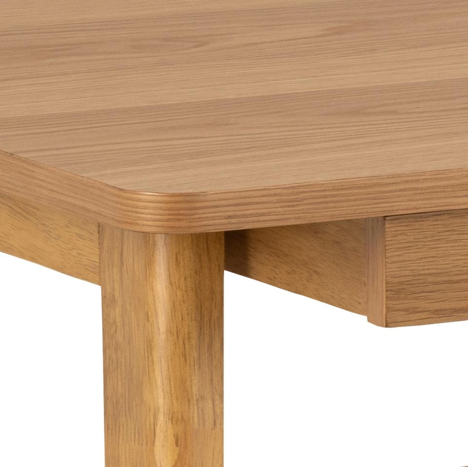 Solidna konstrukcja biurka Barnett opiera się na podstawie z drewna kauczukowego, które zostało starannie pomalowane na kolor dębu. Ta kombinacja materiałów i kolorów sprawia, że biurko doskonale wpisuje się w styl japandi, łącząc w sobie harmonię natury i funkcjonalność. Wbudowana szuflada dodatkowo zwiększa organizacyjny charakter mebla, czyniąc go idealnym wyborem do mniejszych przestrzeni biurowych.