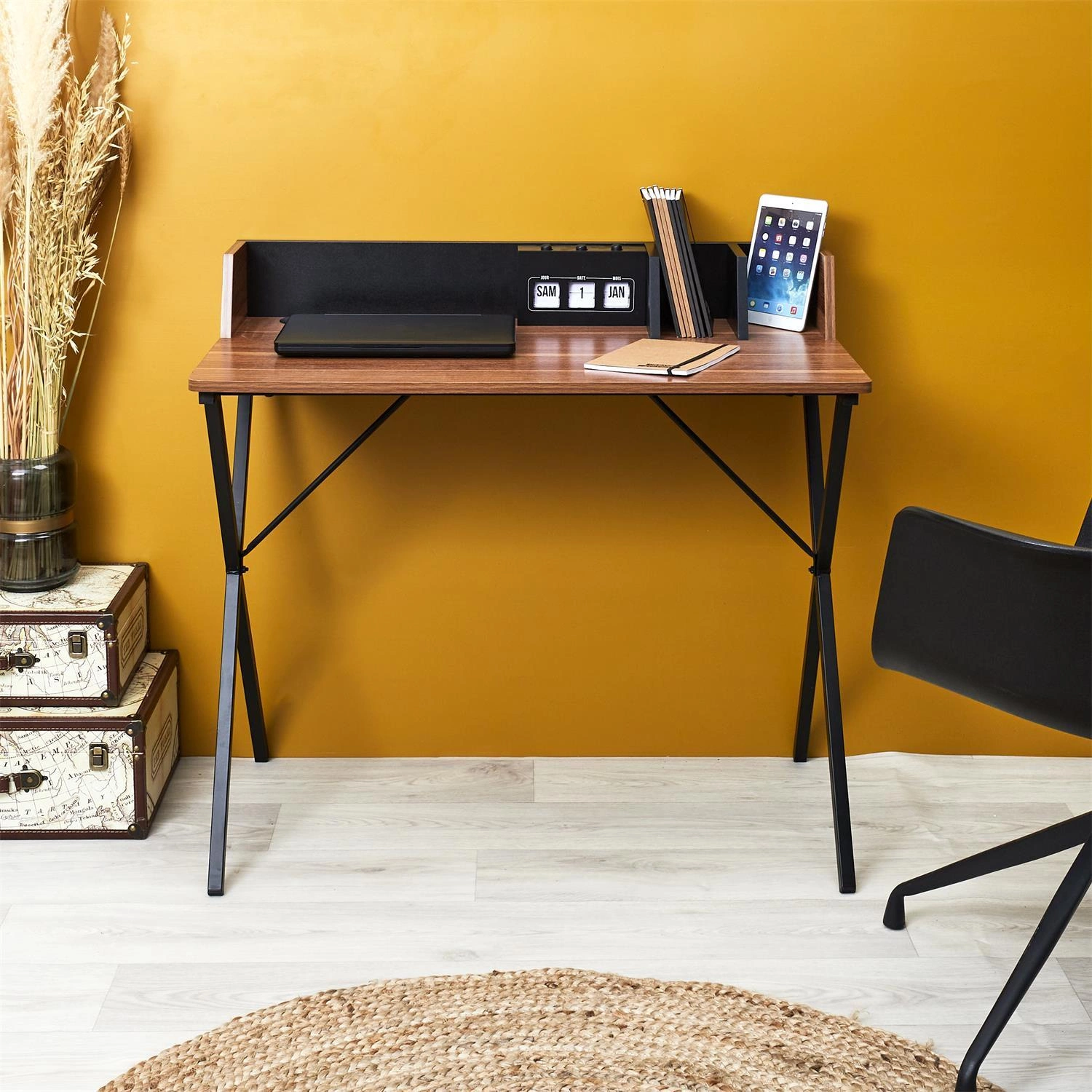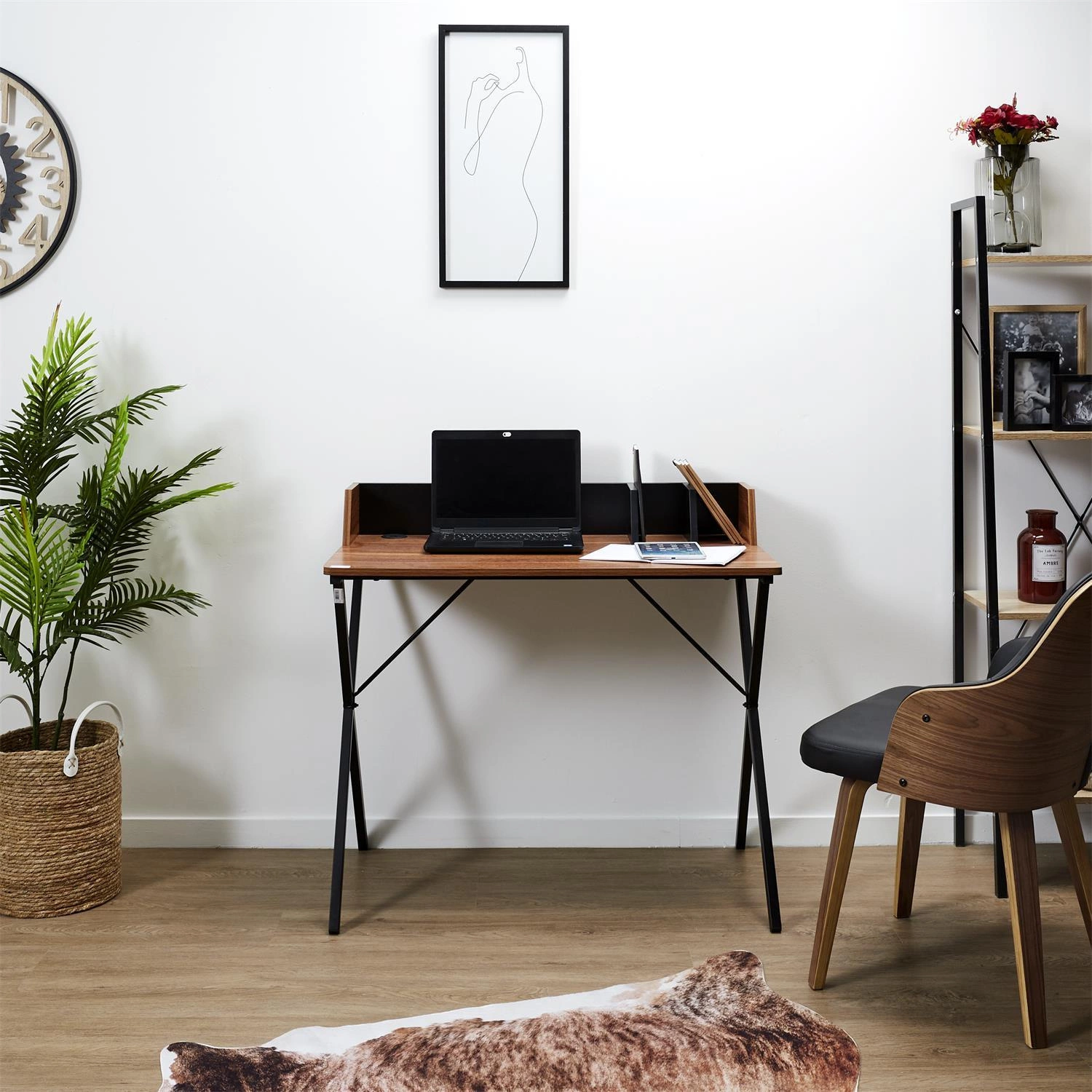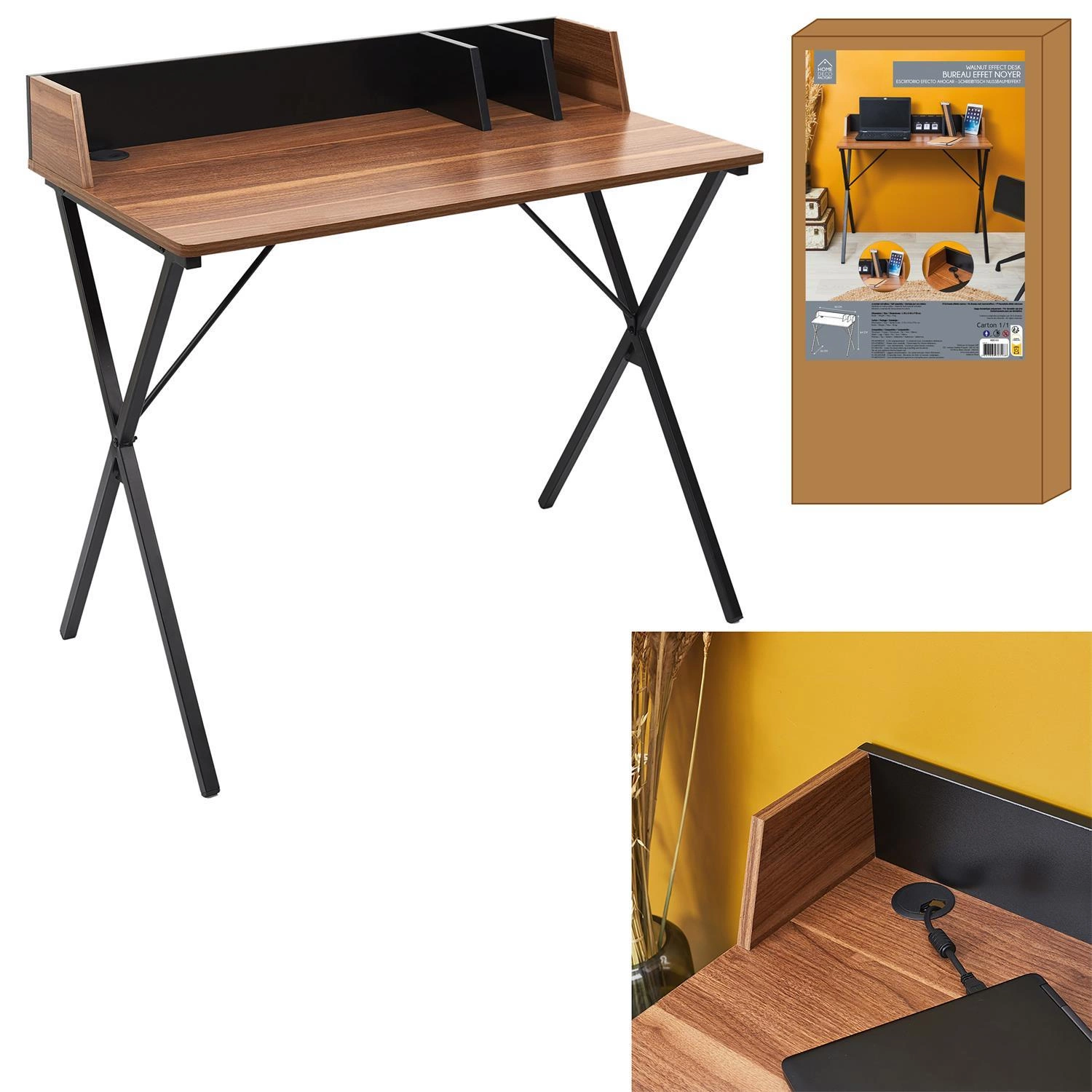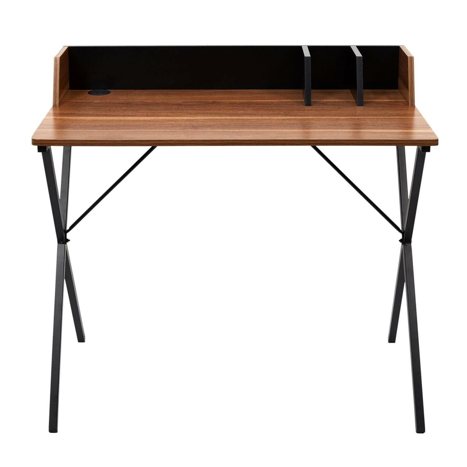 Deska zapewnia większe bezpieczeństwo i spokój podczas pracy.Nie tylko funkcjonalność, ale również wygląd biurka przyciąga uwagę. Prosta konstrukcja, blat z laminowanej płyty MDF w kolorze drewna orzecha oraz metalowa, stylowa podstawa nadają biurku niepowtarzalnego uroku. Dzięki temu biurko doskonale odnajdzie się w różnych pomieszczeniach - biurze, gabinecie, a nawet w pokoju młodzieżowym.