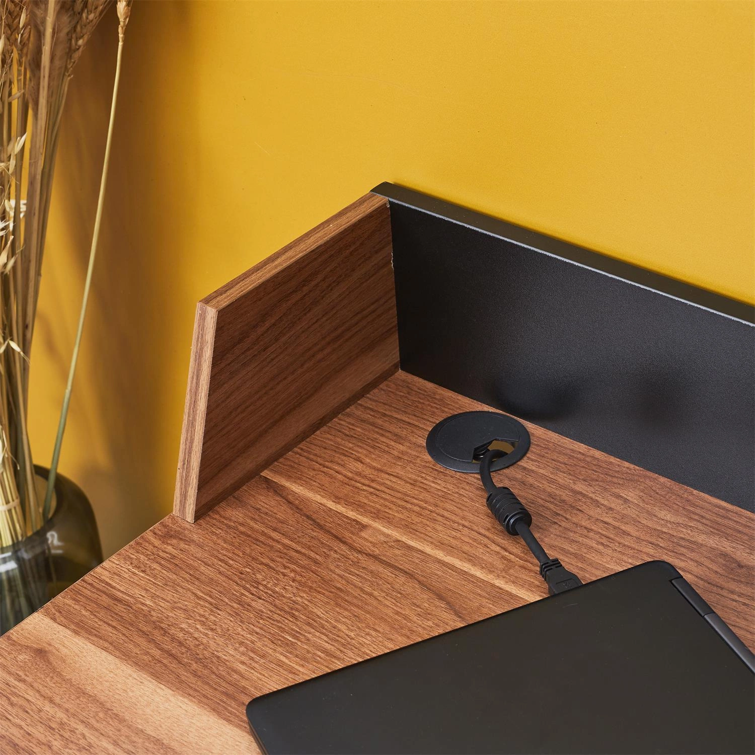 - Czarna deska na blacie biurka chroni przedmioty przed upadkiem za biurko, co zapewnia większe bezpieczeństwo i ochronę przed uszkodzeniami