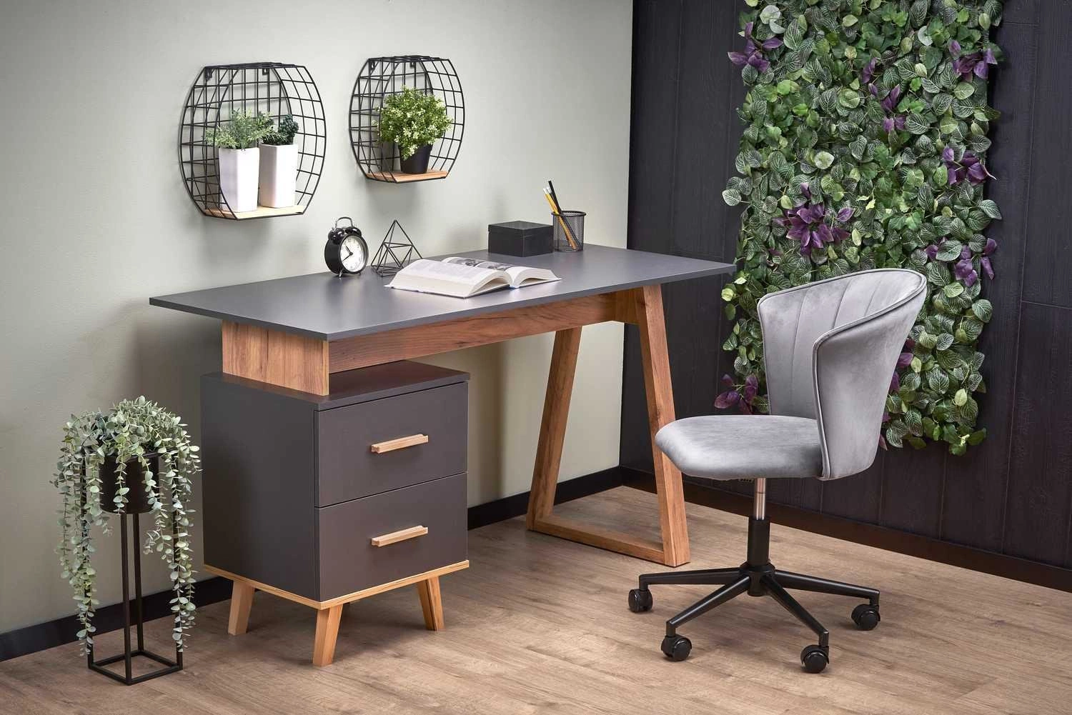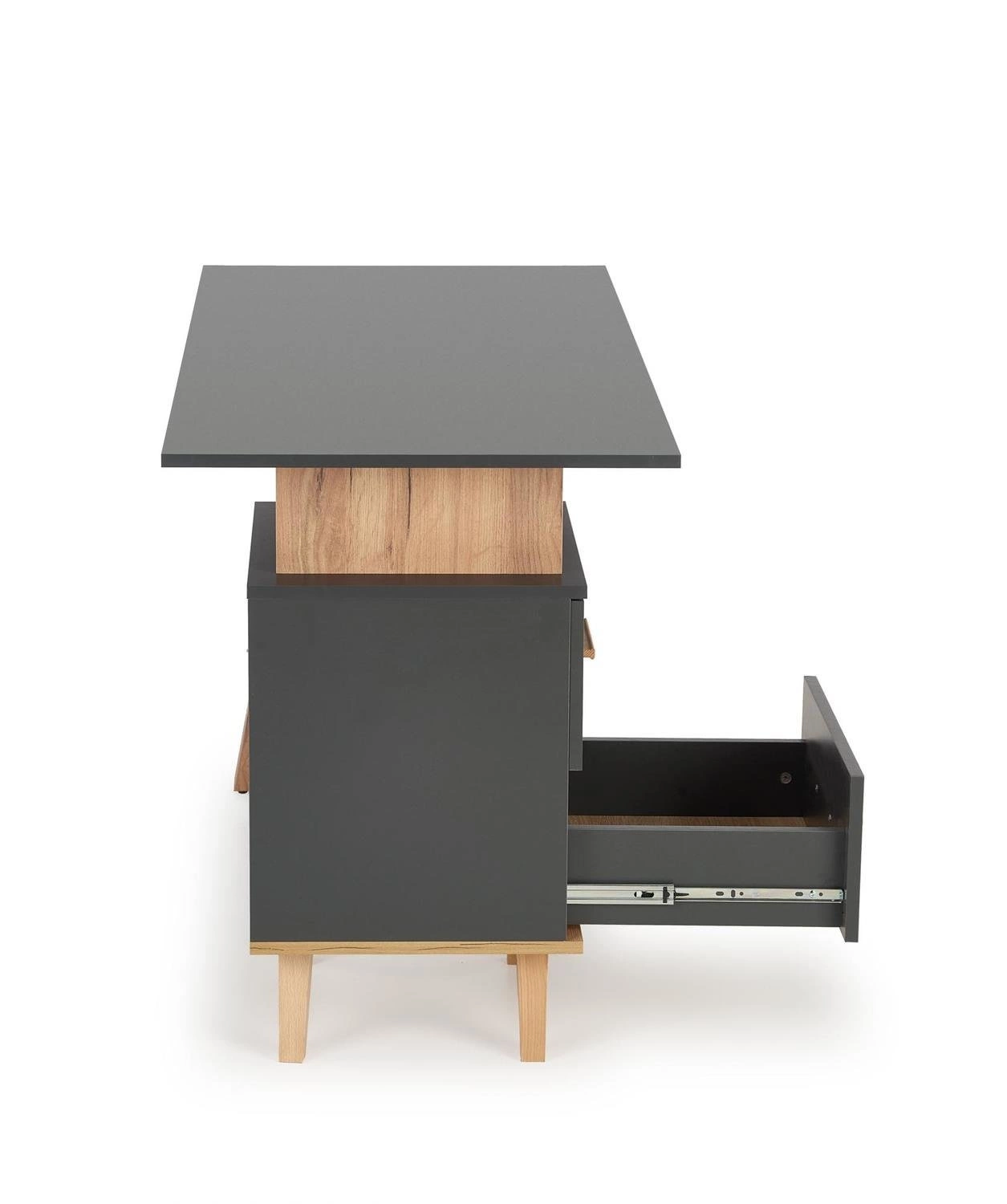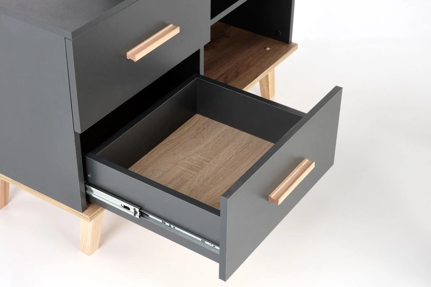 Biurko do pracy z szufladami Exena marki Intesi to nowoczesne biurko skandynawskie o prostokątnym blacie w kolorze antracytowym, uzupełnionym o naturalny odcień dębu wotan. Dzięki regulowanej szerokości 134–165 cm oraz głębokości 60 cm, model ten odpowiada na potrzeby zarówno domowego biura, jak i pokoju młodzieżowego. Dwie praktyczne szuflady zapewniają wygodne przechowywanie dokumentów i akcesoriów, a solidna podstawa z drewna gwarantuje stabilność podczas codziennego użytkowania.