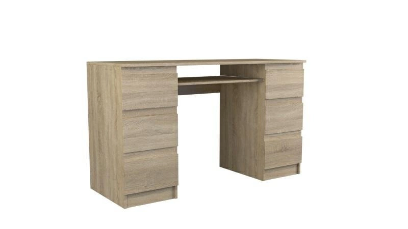 Biurko Felice Sonoma wykonane jest z wysokiej jakości materiałów, takich jak płyta wiórowa laminowana, co gwarantuje jego trwałość i odporność na uszkodzenia mechaniczne i chemiczne. Obrzeża wykończone tworzywem PCV dodatkowo zwiększają jego wytrzymałość. Dzięki dogodnym wymiarom (głębokość: 51 cm, szerokość: 130 cm, wysokość: 76 cm), biurko doskonale sprawdzi się w różnych pomieszczeniach, zapewniając komfortową i ergonomiczną przestrzeń do pracy.