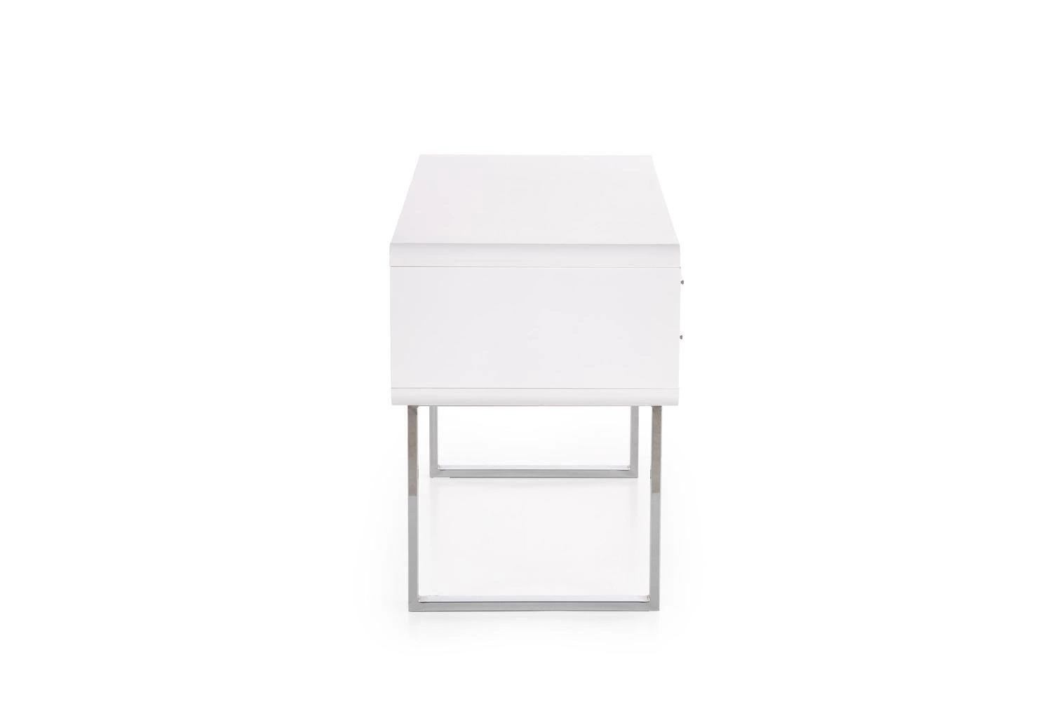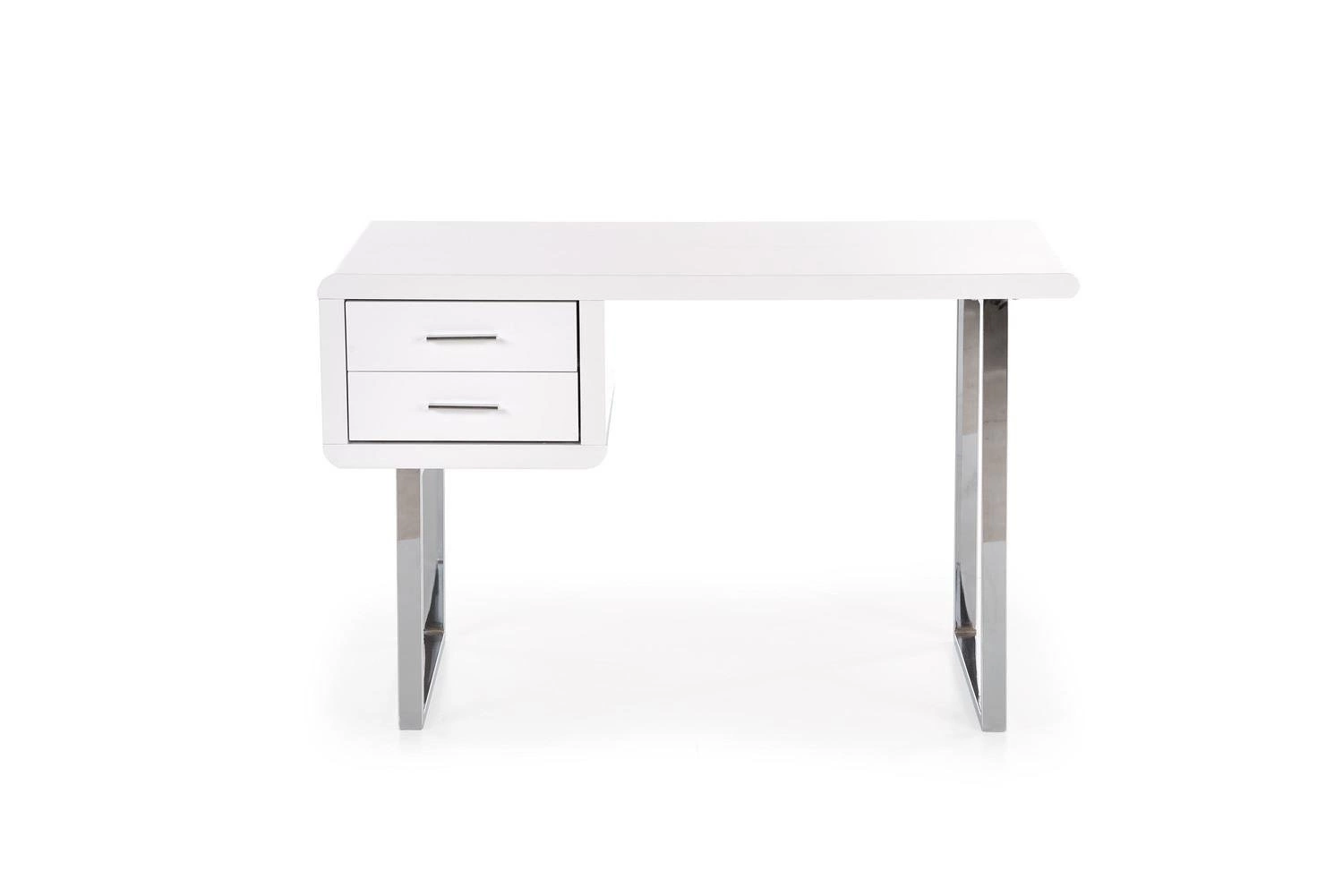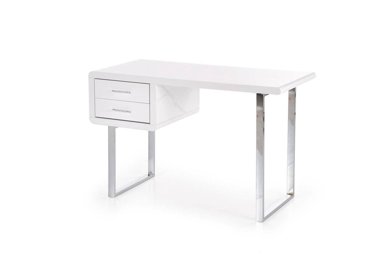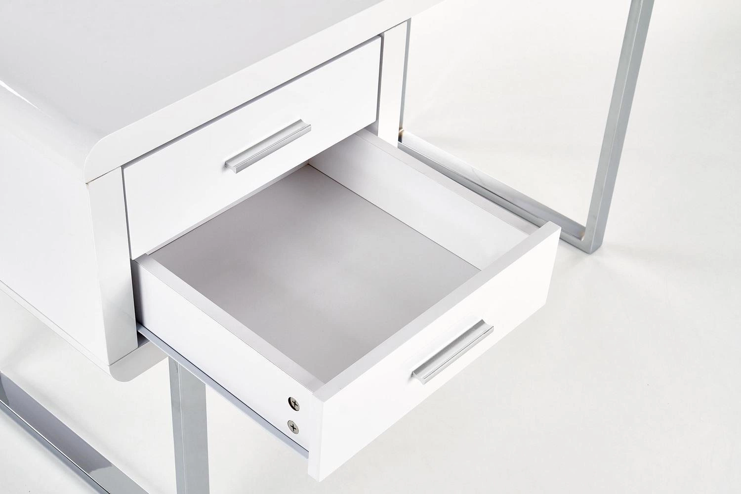 Biurko Gala- Elegancki mebel do Twojego wnętrza Biurko Gala to nie tylko mebel, to również wyraz stylu i praktycznego zastosowania. Biurko o wysokim połysku zwraca uwagę swoją estetyką i starannie przemyślanymi detalami. Wykonane z MDF'u lakierowanego na wysoki połysk, biurko prezentuje się niezwykle elegancko i jest łatwe do utrzymania w doskonałej kondycji. Kontrastująca stal chromowana, tworząca podstawę w postaci płóz, dodaje meblowi nowoczesnej finezji. Biurko Gala łączy w sobie funkcjonalność i styl. Dwie szuflady z metalowymi uchwytami dostarczają praktycznej przestrzeni do przechowywania, pozwalając utrzymać porządek w miejscu pracy. Chromowane płozy stanowią nie tylko wyjątkową podstawę, ale również atrakcyjny element dekoracyjny, który nadaje biurku charakteru. To biurko jest równie wszechstronne jak piękne. Pasuje do różnych rodzajów wnętrz, a w szczególności nowoczesnych i glamour, dodając im elegancji i wytworności. Może pełnić rolę biurka, tworząc funkcjonalne miejsce do pracy, jak i toaletki, oferując wyjątkowe miejsce do codziennej pielęgnacji. Przygotuj się na mądry wybór! Biurko Gala łączy elegancję z praktycznością, tworząc mebel doskonały pod względem zarówno wyglądu, jak i użytkowania. Biały MDF lakierowany na wysoki połysk w połączeniu z chromowaną stalą tworzą elegancki kontrast. Dwie szuflady z metalowymi uchwytami zapewniają miejsce do przechowywania, utrzymując porządek wokół biurka. Biurko może służyć zarówno jako funkcjonalne biurko do pracy, jak i wytworna toaletka, dodając elegancji do przestrzeni.