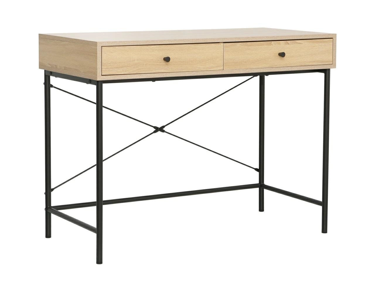 Biurko Hornet to doskonałe rozwiązanie dla osób ceniących nowoczesny, loftowy styl oraz funkcjonalność. Blat biurka wykonany z płyty laminowanej ozdobionej laminatem imitującym słoje drewna dębowego nadaje meblowi elegancki i naturalny wygląd. Solidny blat jest wsparty na metalowym stelażu pomalowanym proszkowo, co zapewnia wytrzymałość i stabilność. Pod blatem znajdują się dwie praktyczne szuflady z metalowymi uchwytami, które oferują dodatkowe miejsce do przechowywania niezbędnych akcesoriów biurowych, dokumentów czy drobiazgów. Biurko Hornet doskonale sprawdzi się zarówno w biurze, jak i w domowym gabinecie, dodając wnętrzu charakteru i stylu.