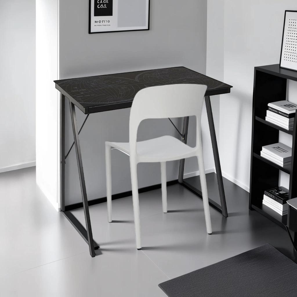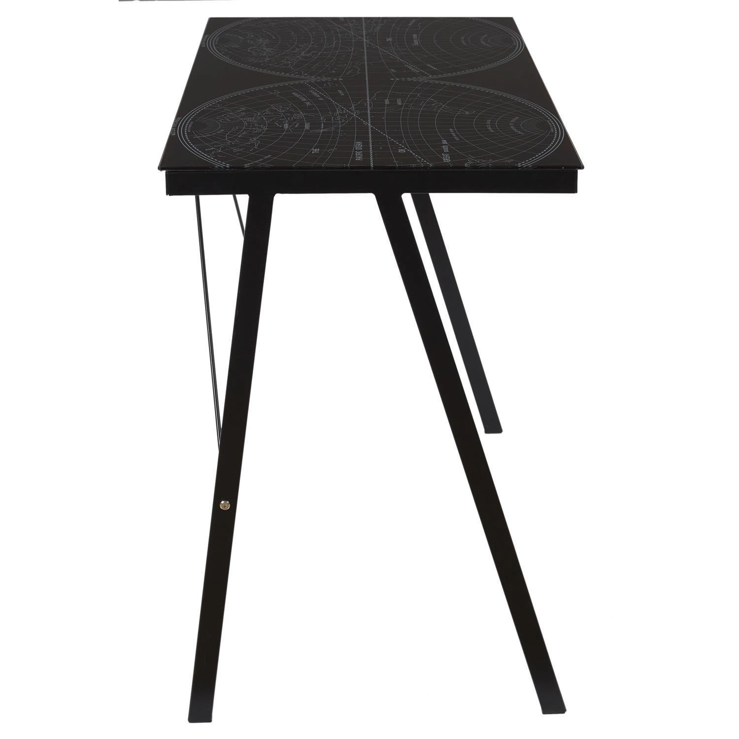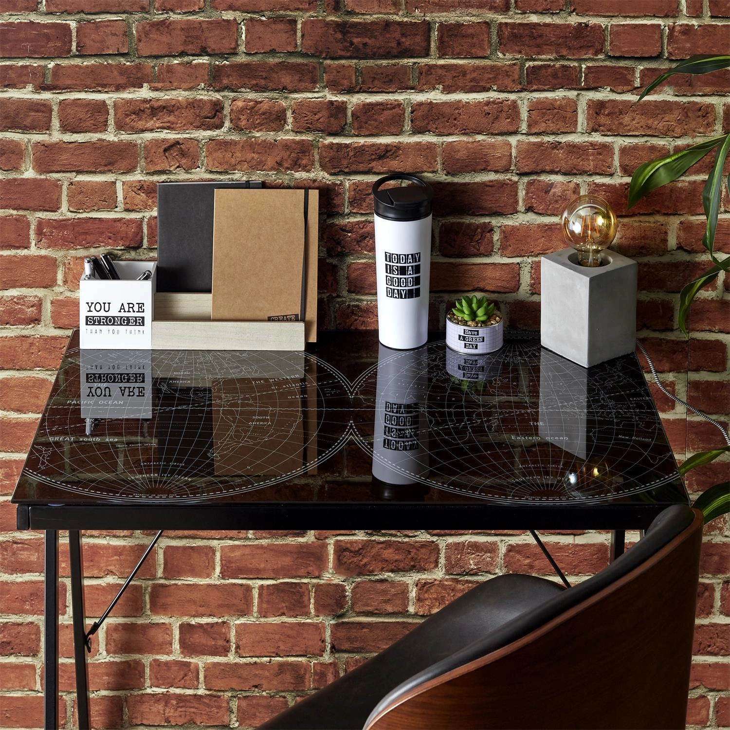 Młodzieżowe BIURKO NAVIGO to doskonały mebel nie tylko do gier, ale również do nauki i pracy. Długie godziny przy biurku będą zdecydowanie przyjemniejsze w otoczeniu kreatywnej przestrzeni. Prosta nienachalna forma biurka czyni je ponadczasowym i uniwersalnym. Czarny szklany blat ozdobiony został grafiką z mapą świata, co przypadnie do gustu wielbicielom podróżowania, a także pomoze Twoim dzieciom oswajać się z tematem geografii. Całość podpierają czarne, malowane proszkowo nogi, które dodatkowo stabilizują dwa ukośne metalowe wsporniki. Całe biurko jest stabilne i bezpieczne w użytkowaniu.