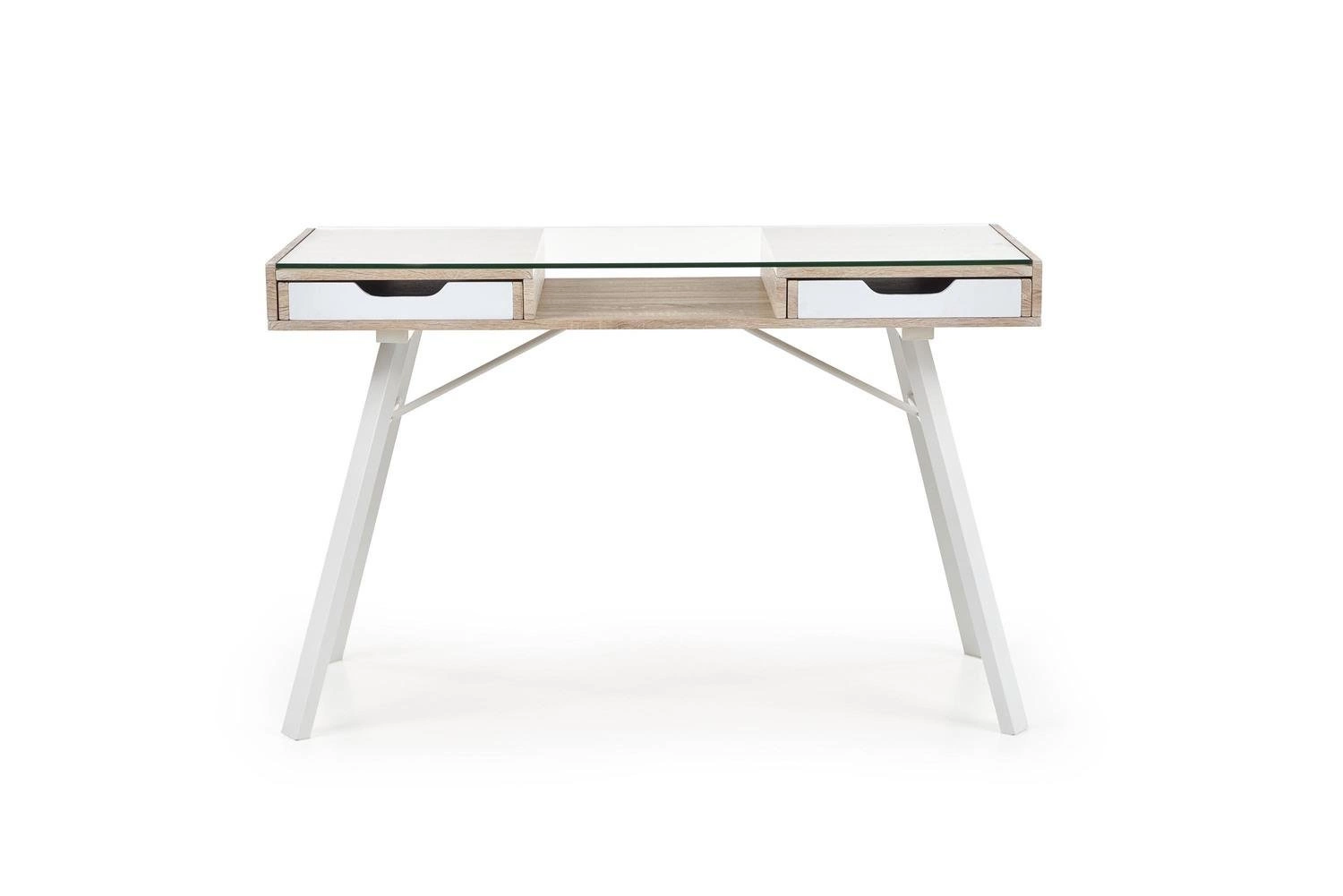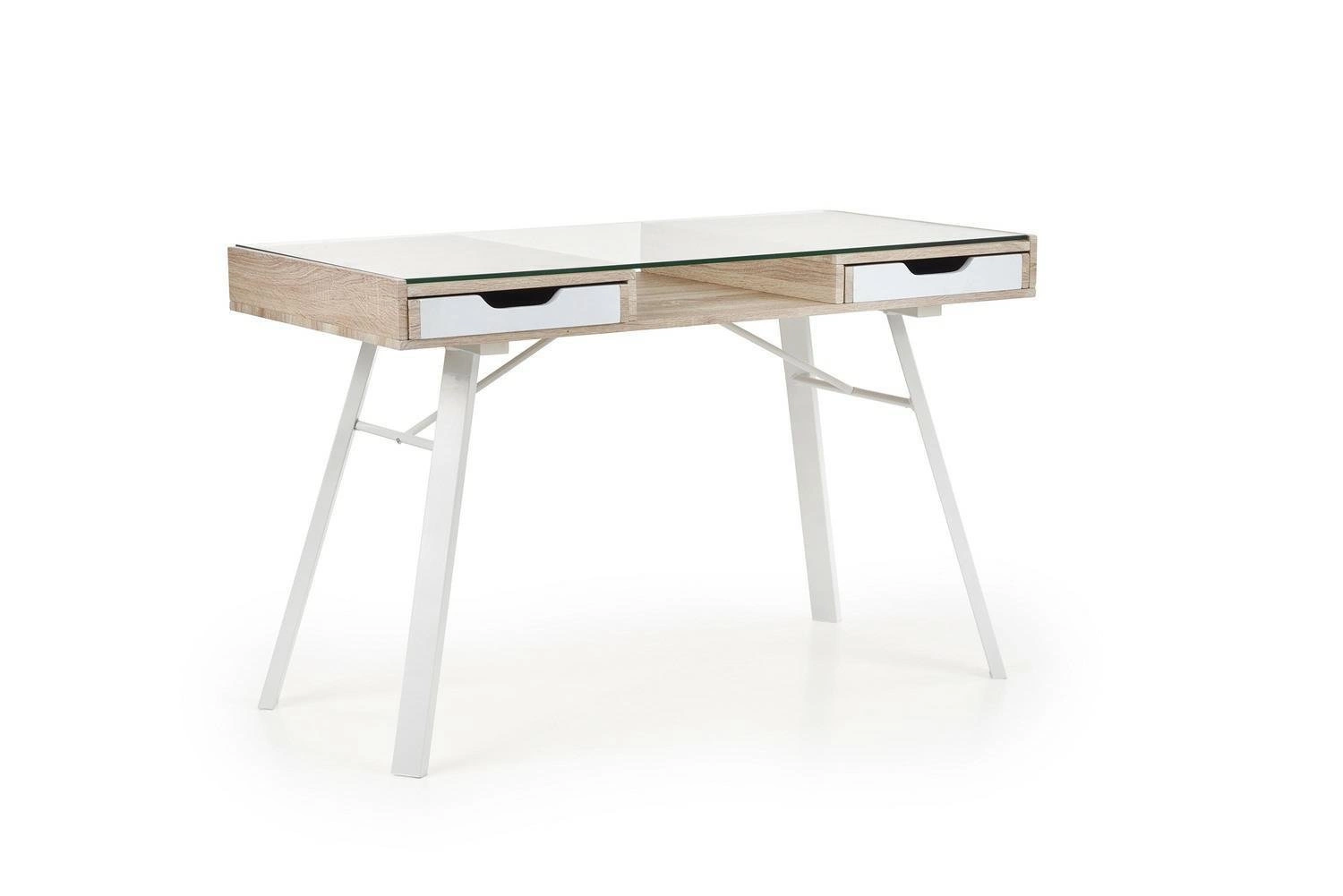 Biurko Sabal- Wyjątkowy minimalistyczny design Biurko Sabal to wyjątkowy mebel, który zachwyca nie tylko swoim designerskim wyglądem, ale także funkcjonalnością oraz wszechstronnością zastosowania. Wykonane z najwyższej jakości materiałów, zostało stworzone, aby spełnić oczekiwania zarówno miłośników minimalistycznego stylu skandynawskiego, jak i entuzjastów nowoczesnych aranżacji wnętrz. Zastosowany MDF laminowany w kolorze dąb sonoma nadaje biurku eleganckiego charakteru, podkreślając jednocześnie jego uniwersalność. Blat wykonany ze szkła hartowanego nie tylko prezentuje się niezwykle stylowo, ale także jest trwały i łatwy w utrzymaniu w czystości. Stal malowana proszkowo na biało stanowi solidną podstawę mebla, gwarantując stabilność i trwałość mebla. Co więcej, biurko Sabal zostało wyposażone w dwie szuflady z wyfrezowanymi uchwytami, co nie tylko ułatwia otwieranie i zamykanie, ale również dodaje meblowi subtelności i nowoczesności. Półka pod blatem to idealne miejsce na przechowywanie drobnych przedmiotów, dzięki czemu utrzymasz porządek na swoim biurku lub toaletce. Mebel ten sprawdzi się doskonale zarówno jako funkcjonalne biurko do pracy, jak i jako elegancka toaletka, dodająca uroku codziennym rytuałom pielęgnacyjnym. Jego designerski wygląd wkomponuje się harmonijnie zarówno w aranżacje skandynawskie, gdzie dominują jasne barwy i naturalne materiały, jak i w nowoczesne przestrzenie, gdzie minimalizm idzie w parze z funkcjonalnością. Upewnij się, że to dobry wybór! Biurko Sabal łączy w sobie funkcjonalność oraz designerski wygląd. Materiały najwyższej jakości, takie jak MDF laminowany, stal malowana proszkowo oraz szkło hartowane, gwarantują trwałość mebla. Szklany blat i dwie szuflady z wyfrezowanymi uchwytami dodają mu nowoczesnego charakteru. Półka pod blatem umożliwia przechowywanie niezbędnych przedmiotów w zasięgu ręki. Biurko doskonale pasuje zarówno do wnętrz w stylu skandynawskim, jak i nowoczesnym, nadając im eleganckiego akcentu.