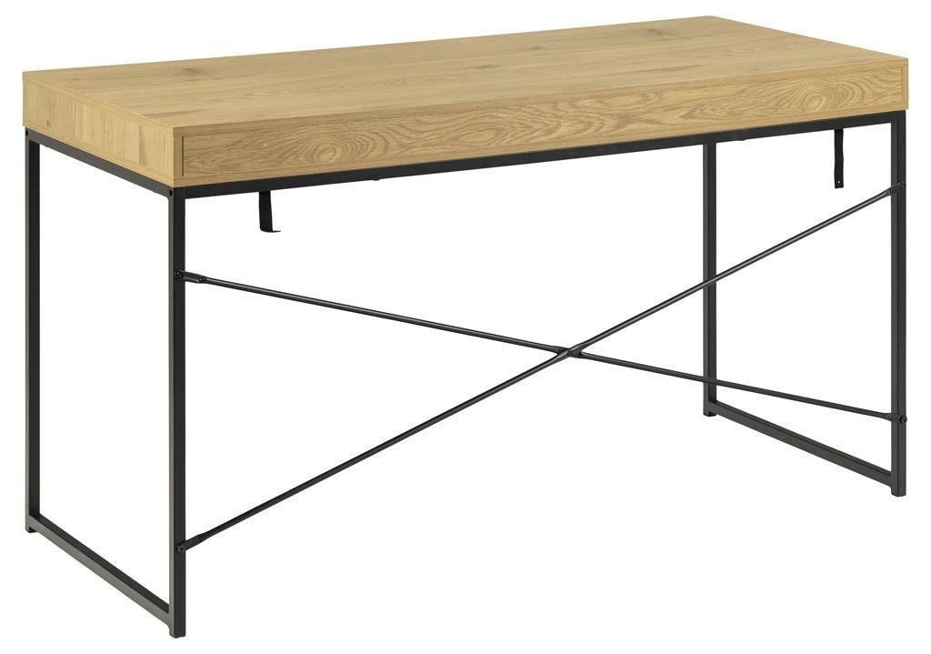 Podstawą idealnego biura i miejsca do nauki w mieszkaniu jest piękne i praktyczne biurko. Seaford tak jak cała kolekcja o tej samej nazwie proponuje subtelne połączenie prostej użytkowej formy z wytrzymałymi materiałami. Jego podstawa wykonana jest z malowanego proszkowo metalu w kolorze czarnym, który zapewnia stabilność. Blat stanowi płyta MDF, pokryta dębową okleiną. Z tego samego materiału wykonana jest znajdująca się pod blatem szuflada oraz dodatkowy otwarty schowek. Front szuflady uzupełniony jest w metalowy wygodny uchwyt. Cechą wyróżniającą biurko są dwa krzyżujące się metalowe elementy z tyłu biurka, które dodadzą charakteru w pokoju młodzieżowym i biurze.