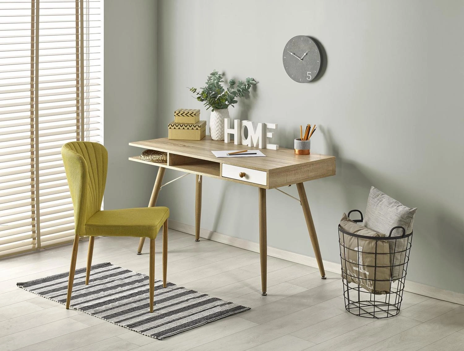 Biurko Interi dąb sonoma/ białe Biurko Interi w kolorze dębu sonoma z białymi akcentami to mebel łączący minimalistyczny design, funkcjonalność oraz wysoką jakość wykonania. Jego wymiary 120/60/75 cm sprawiają, że idealnie komponuje się zarówno w sypialni, jak i pokoju młodzieżowym, doskonale pełniąc rolę zarówno biurka do nauki, pracy czy tworzenia, jak i eleganckiej toaletki. Materiały użyte do produkcji biurka Interi zapewniają trwałość i estetykę. Blat wykonany z MDF-u laminowanego w kolorze dębu sonoma nadaje mu naturalny wygląd drewna, jednocześnie będąc łatwym w utrzymaniu czystości. Białe akcenty dodają meblowi świeżości i współgrają ze skandynawskim lub nowoczesnym stylem. Podstawę biurka stanowią cztery nogi zabezpieczone nakładkami, aby chronić podłogę przed zarysowaniami i uszkodzeniami. Dodatkowym elementem, który wpływa na stabilność mebla, są metalowe wsporniki. Biurko wyposażone jest w jedną białą szufladę oraz dwie półki, co zapewnia dostateczną przestrzeń do przechowywania dokumentów, przyborów biurowych czy osobistych przedmiotów. Funkcjonalność mebla idzie w parze z jego prostym, minimalistycznym designem, który podkreśla harmonię i estetykę wnętrza. O tym warto pamiętać! Biurko Interi to minimalistyczny mebel o wysokiej jakości wykonania. Wykonane z MDF-u laminowanego w kolorze dębu sonoma i metalowych elementów. Posiada jedną białą szufladę oraz dwie półki, zapewniając wystarczającą przestrzeń do przechowywania. Podstawę stanowią cztery nogi zabezpieczone nakładkami i metalowe wsporniki, zapewniające stabilność. Idealne do sypialni, pokoju młodzieżowego lub jako elegancka toaletka, wpisujące się zarówno w styl skandynawski, jak i nowoczesny.