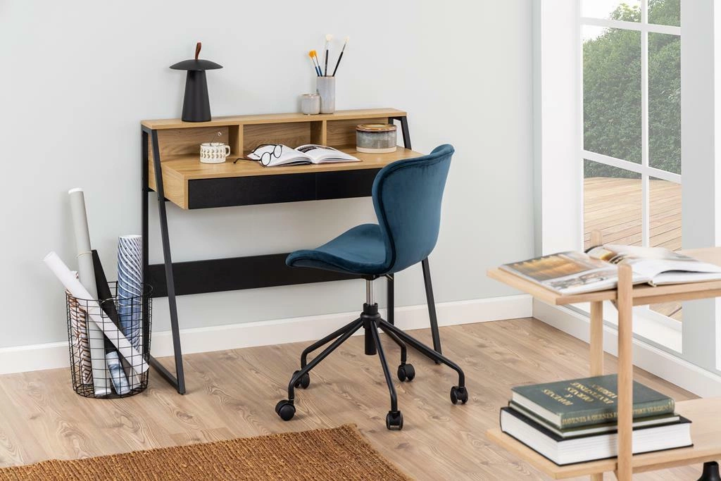 Twoje mieszkanie to kompozycja wyjątkowych form i kształtów? Koniecznie zwróć uwagę na Biurko Reece producenta Actona. Jest to model o niecodziennym designie, który łączy w sobie cechy praktyczne z nowoczesnym pięknym wyglądem. Będzie pasować do wnętrz w industrialnym i skandynawskim. Jego podstawa wykonana została z malowanego proszkowo metalu w kolorze czarnym. Składa się z dwóch trójkątnych płóz oraz płaskiego łącznika, które dodają całości charakteru. Metalowe nogi podtrzymują blat z płyty melaminowej w okleinie imitującej dąb. Z tego samego materiału zrobiona jest także niewielka nadstawka podzielona przez dwie pionowe podziałki. W jej centralnej części znajduje się otwór na kable, który dzięki okrągłej formie nie zakłóca estetyki. Pod blatem znajdują się także dwie głębokie szuflady o ciemnych frontach. Biurko Reece sprawdzi się w biurze, gabinecie i pokoju ucznia.