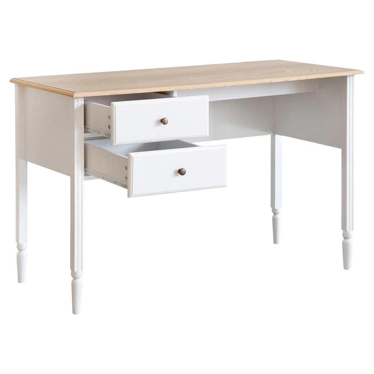 - Biurko wyposażone jest w dwie szuflady z metalowymi, okrągłymi uchwytami.