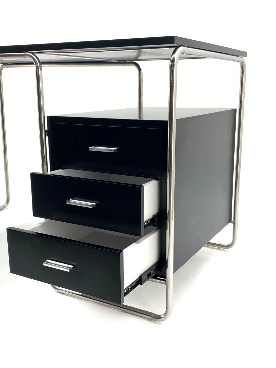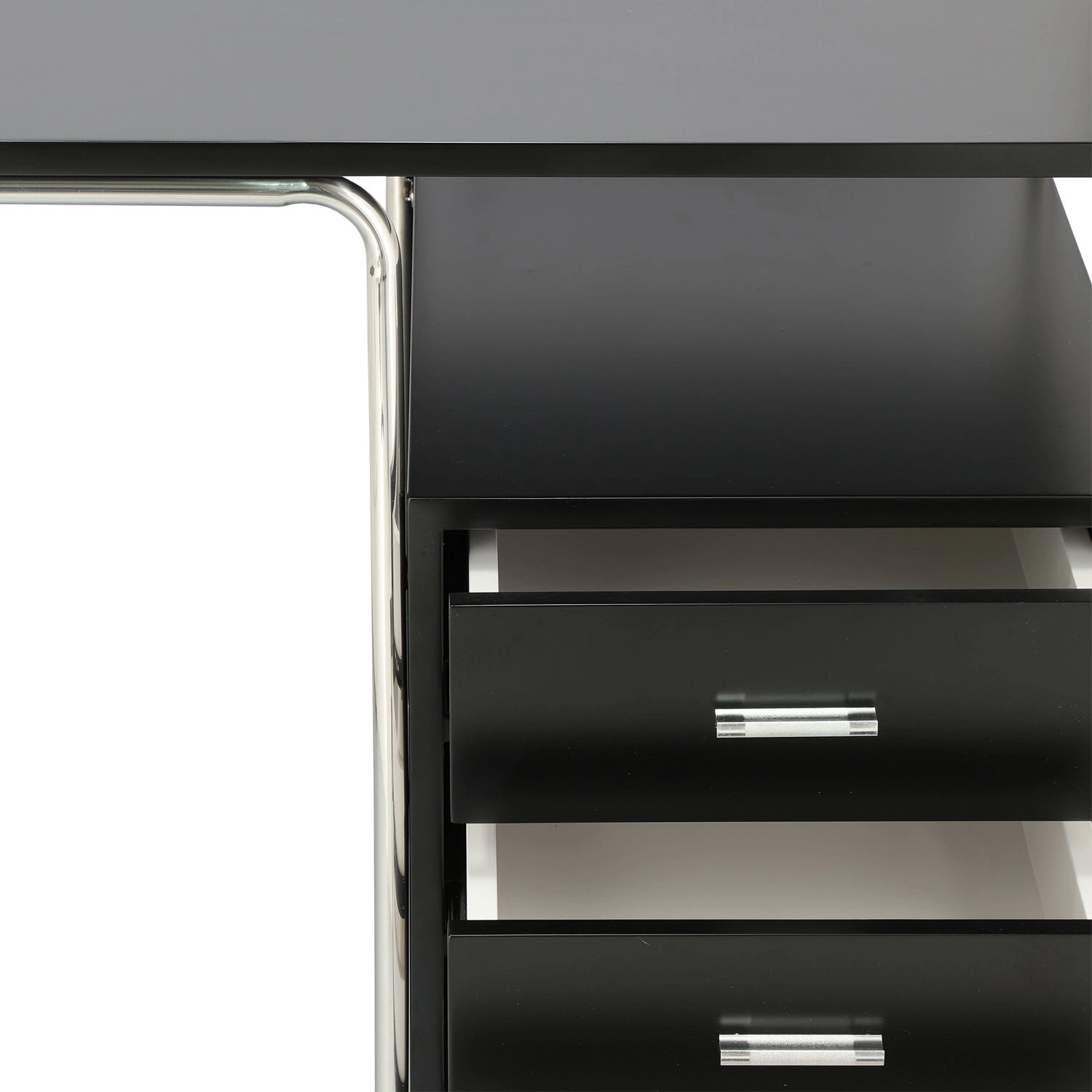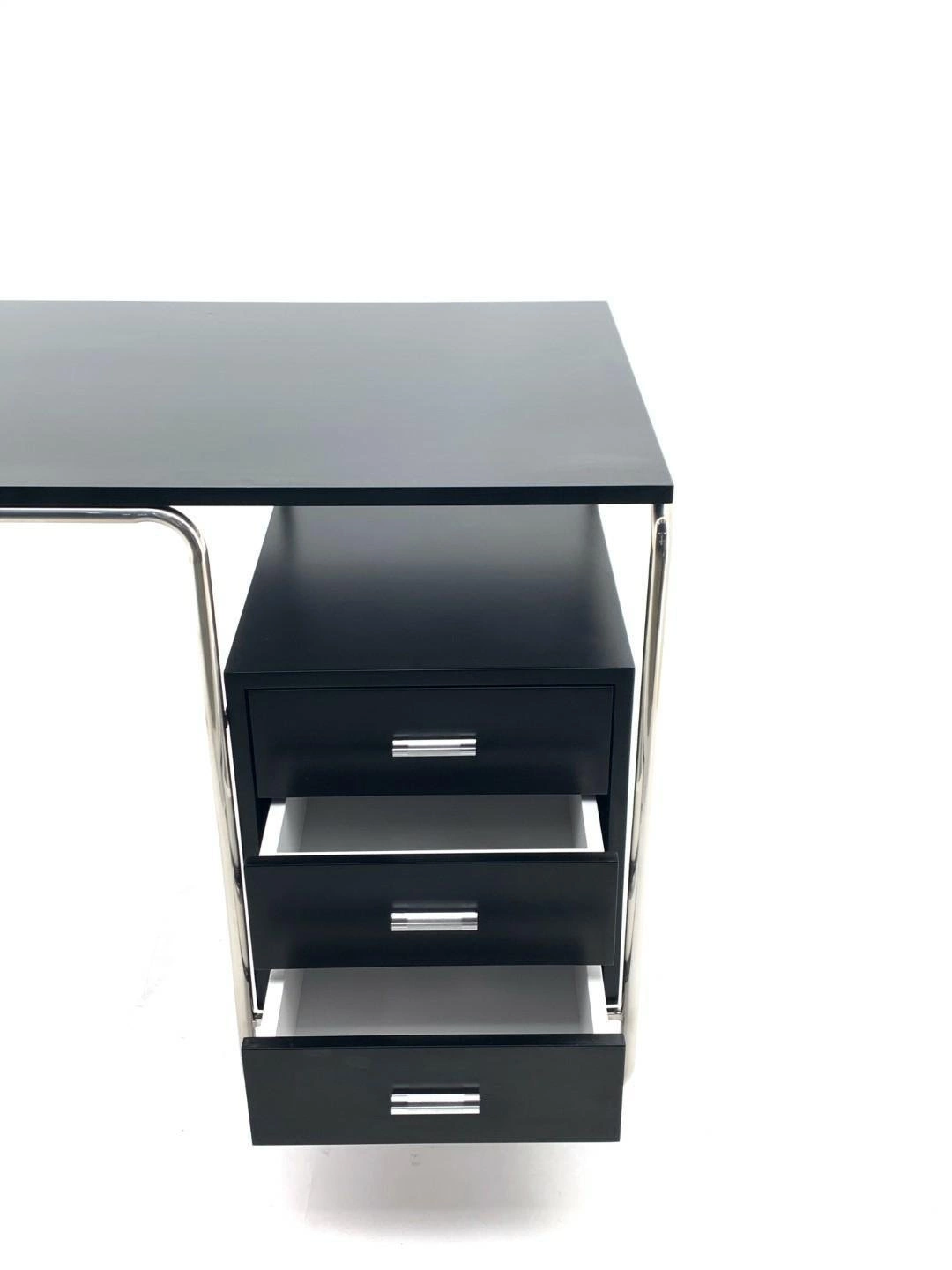 Biurko Thon to genialne w swojej prostocie połączenie wykończonego w wysokim połysku czarnego blatu i eleganckiej chromowanej podstawy. Wbudowana w chromowaną ramę minimalistyczna szafka pozwala na dyskretne przechowywanie dokumentów i akcesoriów biurowych, a duży blat biurka o szerokości 120 cm i głębokości 60 cm oferuje przestrzeń na rozłożenie materiałów oraz sprzętu potrzebnego do pracy. Funkcjonalne biurko z pojemnymi szufladami zostało wykonane z wytrzymałej płyty MDF pokrytej czarnym laminatem. Czerń biurka przełamują chromowane elementy: podstawa i uchwyty szuflad. Inspirowane projektami szkoły Bauhausu biurko nowoczesne Thon idealnie dopełni wystrój minimalistycznego gabinetu oraz pracowni.