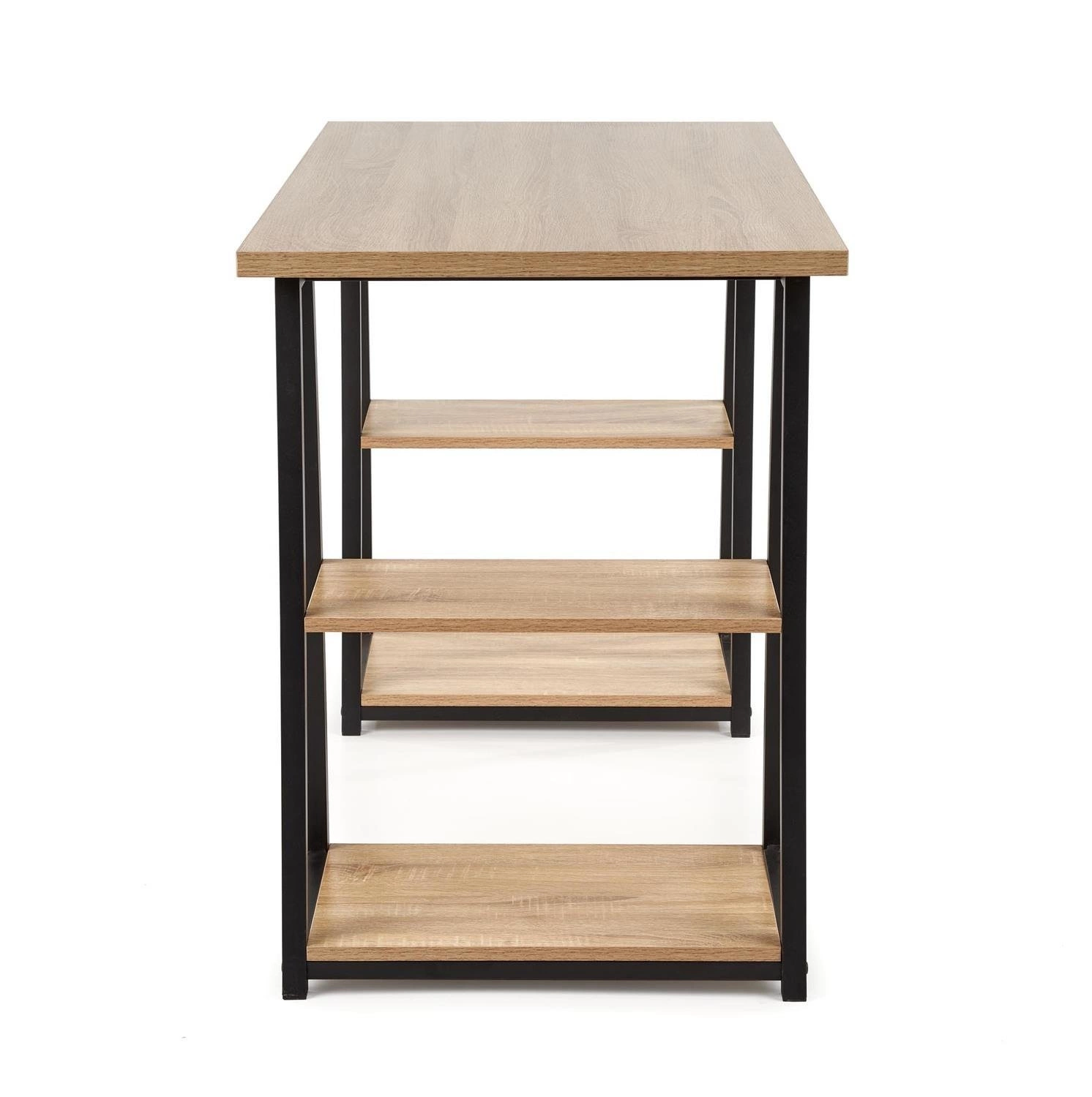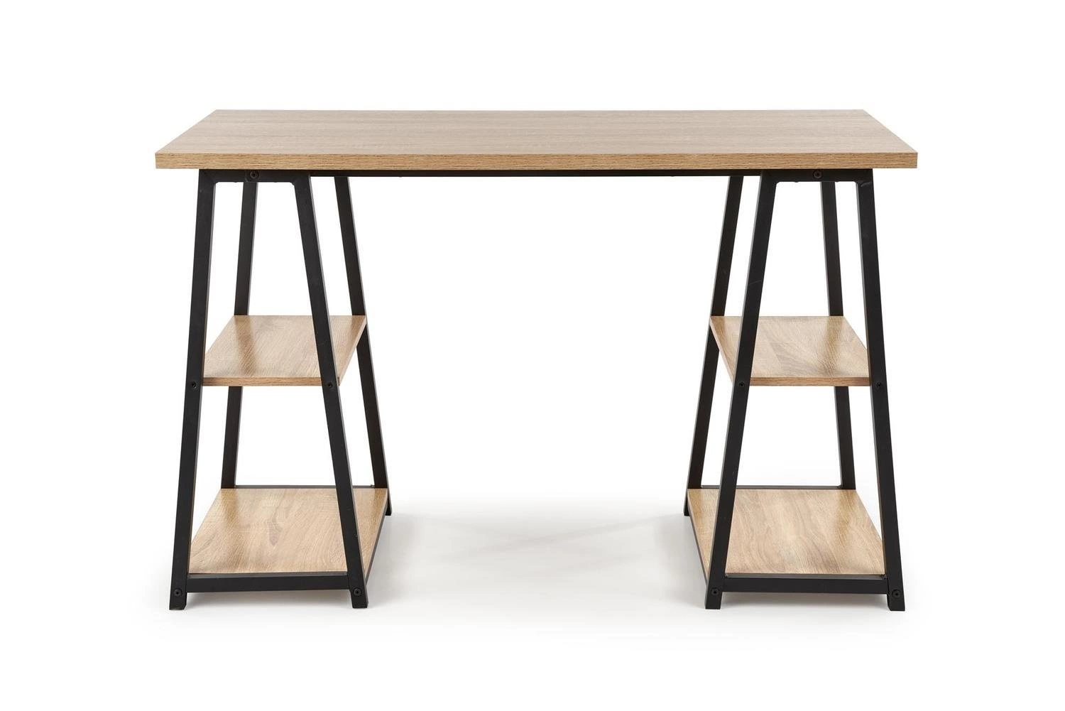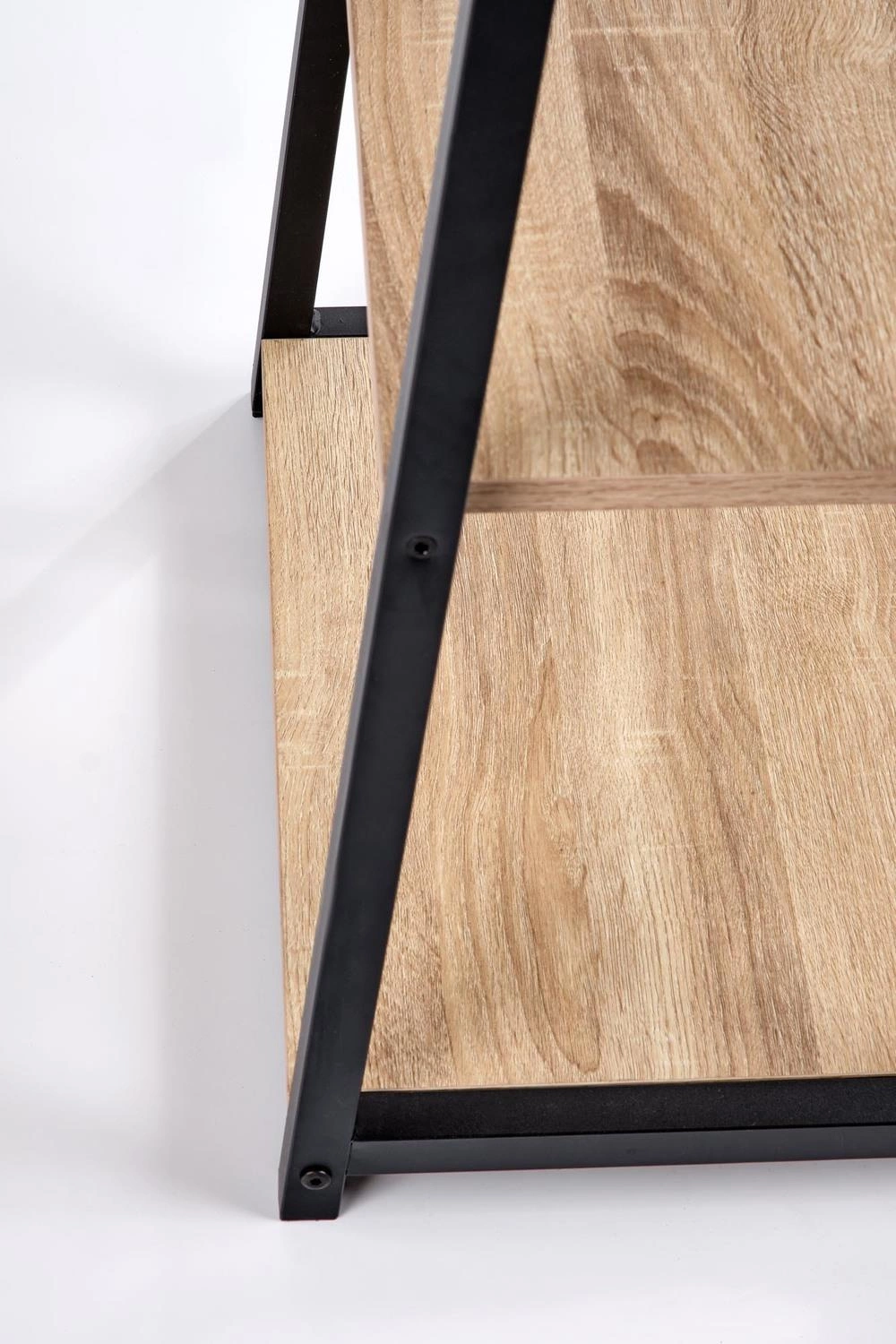 Biurko Womp- Elegancja i funkcjonalność w jednym Biurko Womp w eleganckiej kombinacji dębu sonoma i czerni stanowi doskonałe rozwiązanie dla tych, którzy poszukują zarówno funkcjonalności, jak i nowoczesnego designu w swoim otoczeniu. Znaczący wymiar 120/60/77 cm zapewnia wystarczająco dużo przestrzeni do pracy, tworzenia czy nauki, a jego nietypowa budowa dodaje mu unikalnego charakteru. Konstrukcja biurka opiera się na solidnej płycie meblowej okleinowanej, co zapewnia trwałość i odporność na codzienną eksploatację. Podstawa z malowanej proszkowo stali, wykonana w czarnym kolorze, tworzy kontrastujący akcent, który nadaje biurku nowoczesnego wyrazu. Jednak to nie tylko estetyka przyciąga uwagę - biurko Womp wyróżnia się również innowacyjnym rozwiązaniem. Pomiędzy jego nogami znajdują się dwie półki, tworzące praktyczne schowki. Łącznie biurko posiada cztery półki - po dwie po każdej stronie. To inteligentne rozwiązanie, które pomaga utrzymać porządek w przestrzeni roboczej. Biurko Womp doskonale wpisuje się w nowoczesne i loftowe aranżacje wnętrz. Doskonale sprawdzi się w designerskim biurze, kreatywnym studio lub pokoju młodzieżowym, gdzie funkcjonalność i styl idą w parze. Jego wyjątkowa forma, połączona z praktycznością, sprawia, że staje się ono zarówno miejscem pracy, jak i inspiracji. O tym warto pamiętać! Biurko Womp to połączenie funkcjonalności z nowoczesnym wyglądem. Wykonane z płyty meblowej okleinowanej i stali malowanej proszkowo, biurko zapewnia trwałość i wytrzymałość. Cztery półki pomiędzy nogami mebla tworzą praktyczne schowki, pomagając utrzymać porządek. Doskonale wpisuje się w loftowe i nowoczesne wnętrza, idealne dla designerskiego biura czy pokoju młodzieżowego. Wymiary 120/60/77 cm zapewniają komfortową powierzchnię pracy, tworzenia czy nauki, będąc zarazem źródłem inspiracji.