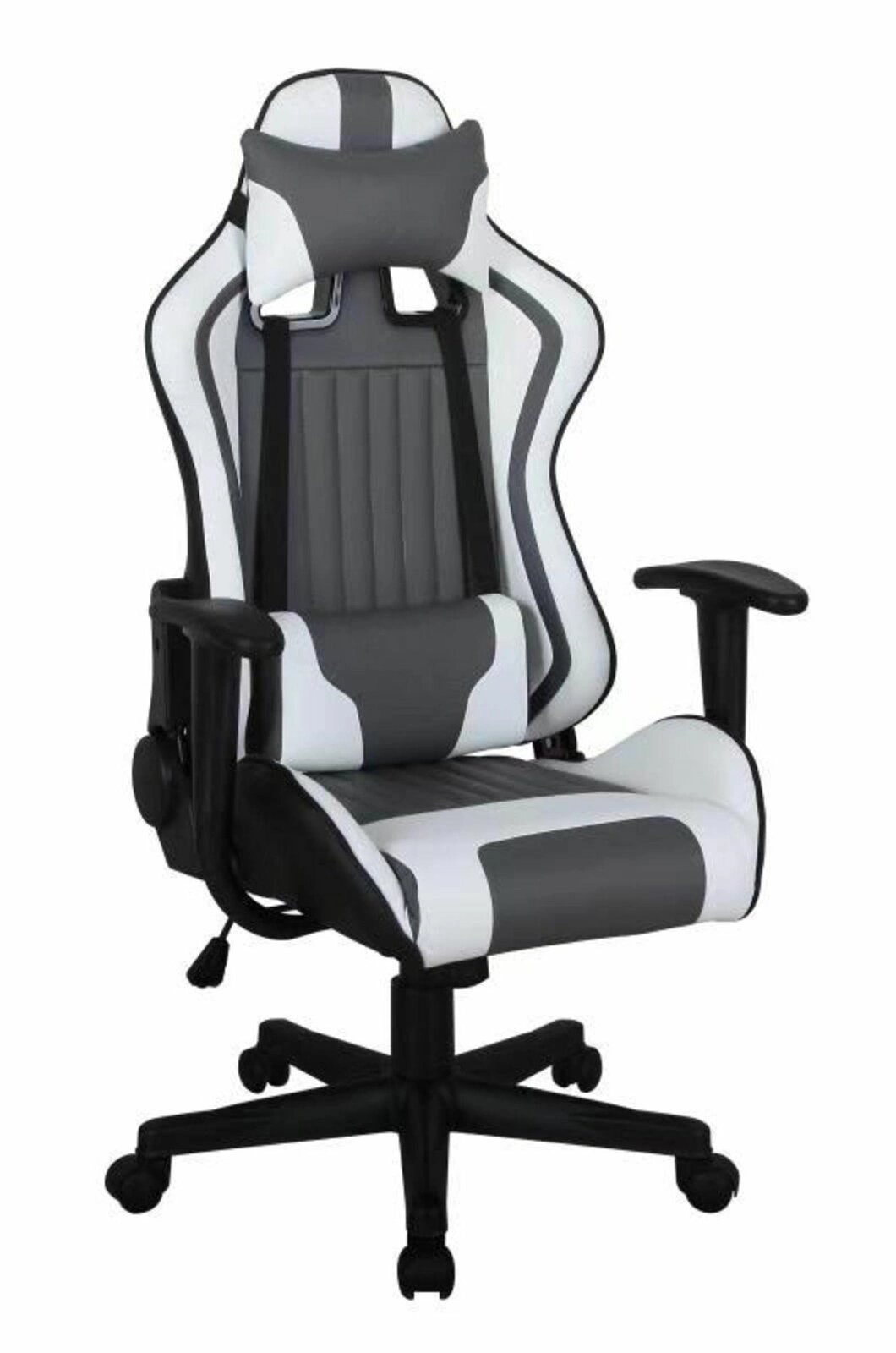 - Eleganckie wykonanie z eko skóry w kolorze szarym z białymi wstawkami, nadające fotelowi nowoczesny i stylowy wygląd