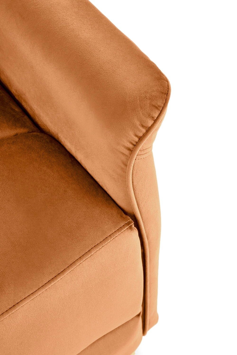Cynamonowy kolor fotela Karlin Velvet wprowadzi do Twojego wnętrza przytulność i wyrafinowaną elegancję. Nowoczesna forma uszaka, subtelne linie oraz czarna podstawa na czterech stabilnych nogach doskonale wpisują się w styl współczesnych aranżacji, czyniąc z tego modelu nie tylko praktyczny, ale i stylowy fotel do salonu czy sypialni. Aksamitne wykończenie podkreśla ekskluzywny charakter mebla, zachęcając do dłuższego wypoczynku.