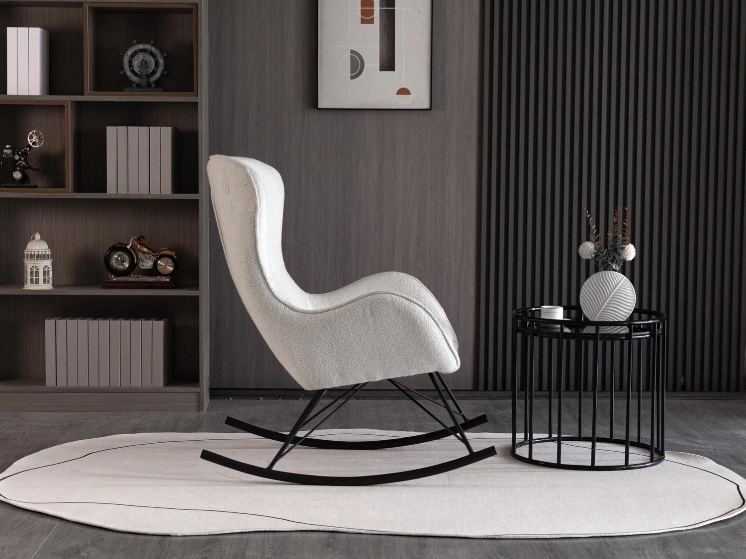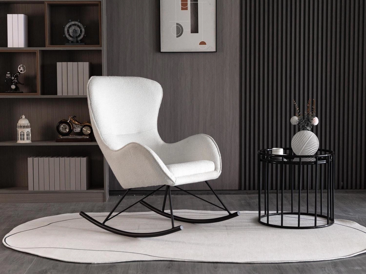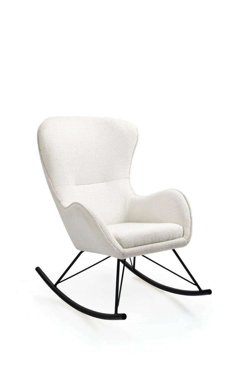 Tapicerka w kolorze białym dodaje fotelowi lekkości i świeżości, jednocześnie tworząc przyjemną atmosferę w pomieszczeniu. Nogi w kolorze czarnym stanowią doskonałe uzupełnienie całości, nadając fotelowi elegancki i nowoczesny wygląd. Jednym z największych atutów tego fotela jest jego wygoda. Dzięki biegunom, możesz się delikatnie bujać i odprężać, co pozwoli Ci na chwilę relaksu po ciężkim dniu. Dodatkowo, miękka tapicerka zapewnia doskonałe podparcie dla pleców i zapewnia maksymalny komfort siedzenia.
