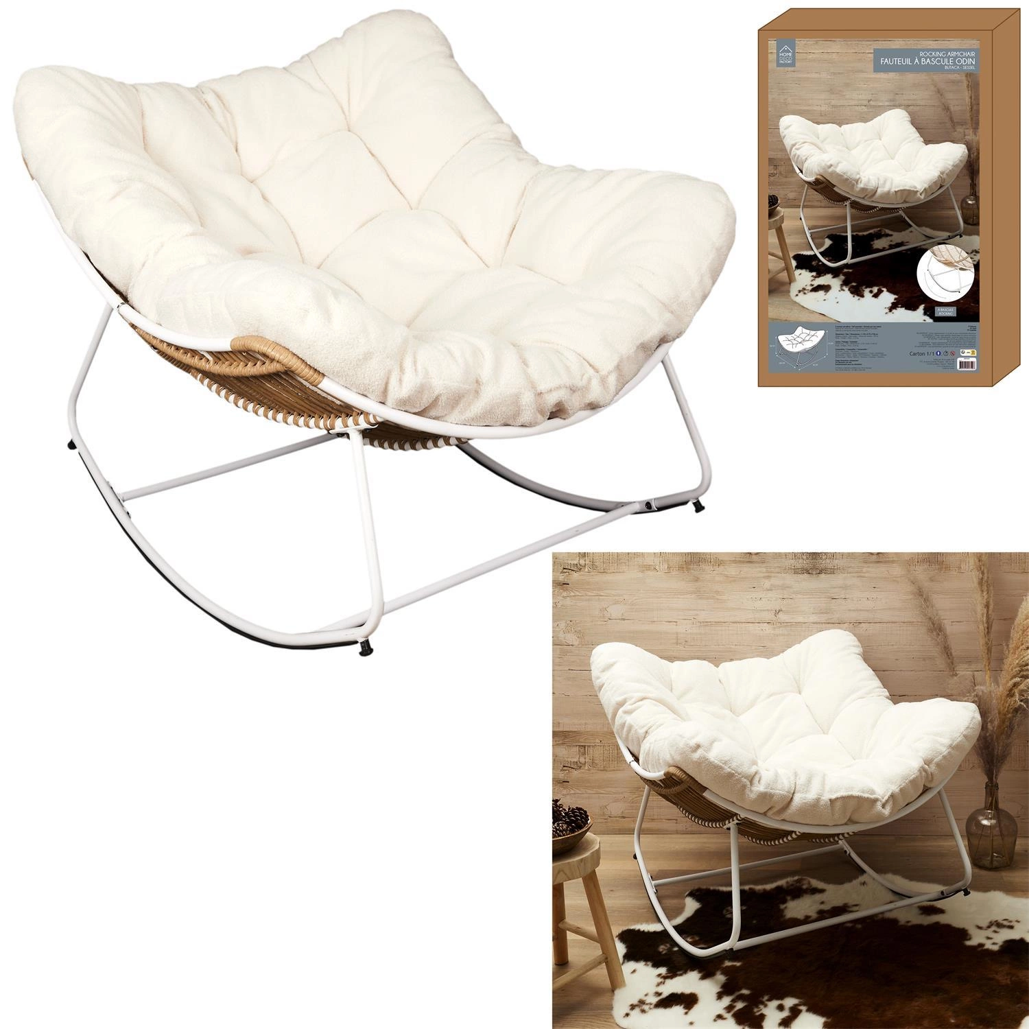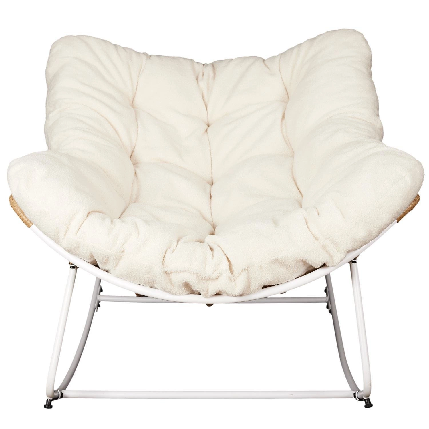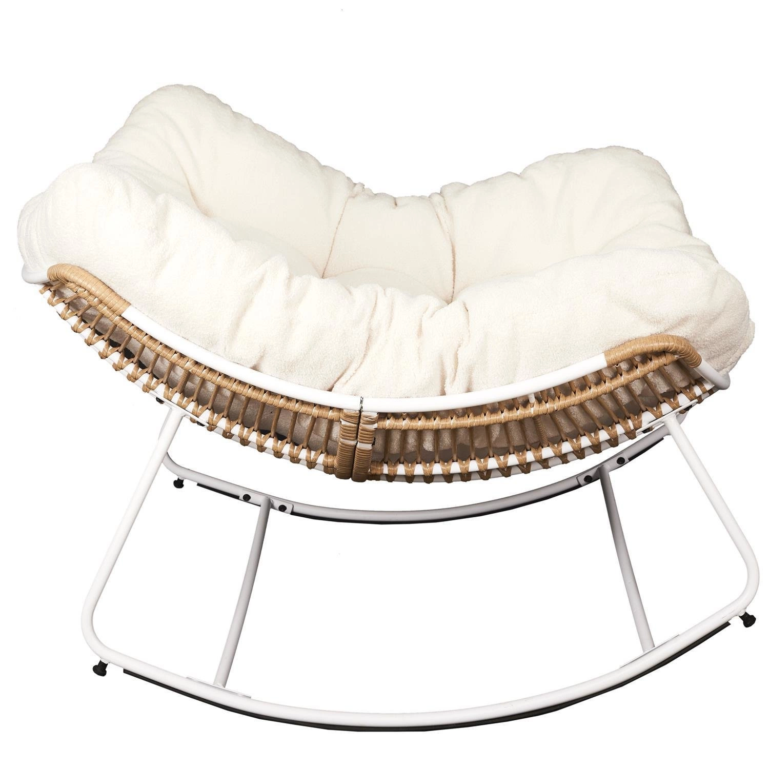 - Modny wygląd dzięki plecionemu siedzisku w kształcie muszli i miękkiej poduszce w kremowej tkaninie teddy bear