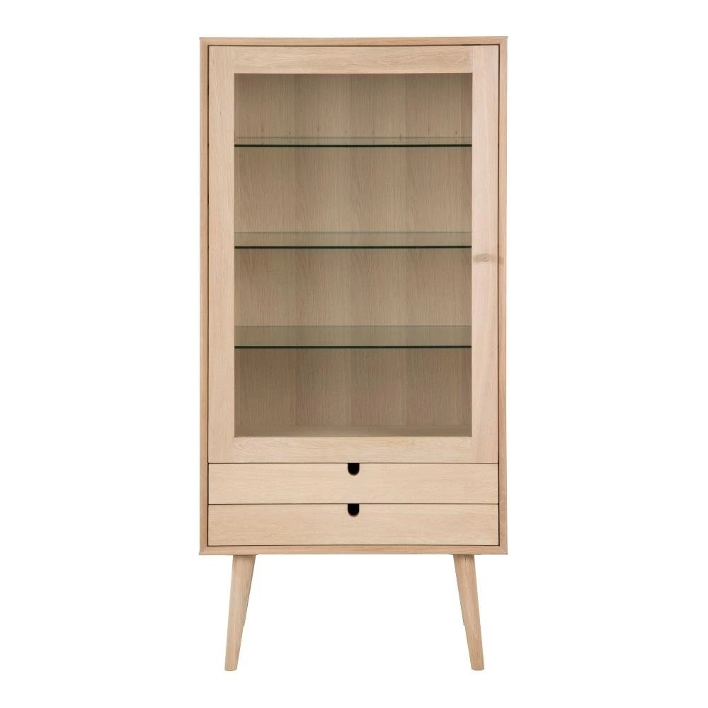 Witryna na książki zamykana Century z bielonego dębu to nieodzowny mebel biura lub gabinetu. Pojemna witryna na książki została zrobiona z bielonego dębu oraz szkła. Regał typu witryna na książki ze szklanym frontem kryje w sobie trzy szklane półki. Pod szafką umieszczone zostały dodatkowo dwie szuflady z frontem z drewna dębu. Fronty mają delikatne wcięcia, które pełnią funkcję uchwytu do otwierania szuflad. Podstawą witryny na książki do salonu są cztery dębowe nogi w kształcie odwróconych stożków.