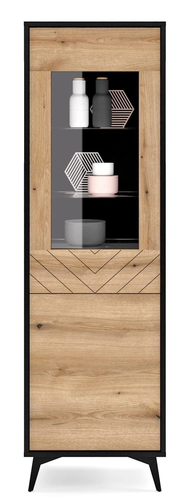 Loftowa witryna na książki na wysokich nóżkach oraz z frontem z dekorem w jodełkę to sprawdzony przepis na centralne miejsce w salonie lub sypialni. Seria mebli Fargo to połączenie czarnego korpusu mebla z frontami w kolorze dębu. Dodatkowe frezowanie w kształcie jodełki to element, który odróżnia serię Fargo od zwykłych loftowych mebli. Do produkcji mebli wykorzystana została wytrzymała płyta meblowa zabezpieczona okleiną imitującą naturalne drewno. Meble z serii Fargo nie posiadają standardowych uchwytów, a otworzyć możemy je dzięki wygodnej funkcji push to open. Za pomocą naciśnięcia na front, mebel lekko się otwiera. Podstawą tej nowoczesnej witryny na książki są metalowe nogi o zwężającej się budowie i zarazem o konstrukcji lekko rozszerzającej się na zewnątrz.