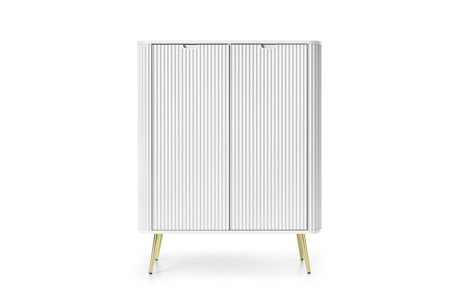 Komoda Seda to propozycja dla miłośników nowoczesnych aranżacji, którzy cenią sobie połączenie funkcjonalności z subtelną ozdobnością. Biały korpus zestawiony ze złotymi, smukłymi nogami sprawia, że mebel lekko unosi się nad podłogą, nie przytłaczając przestrzeni. Pionowe frezy na frontach dodają głębi i urozmaicają wizualnie płaską powierzchnię, a półmatowe wykończenie podkreśla nowoczesny styl całej kolekcji. Taki detal sprawia, że komoda biała Seda doskonale wpisuje się zarówno w jasne, minimalistyczne wnętrza, jak i bardziej glamour czy eleganckie aranżacje.