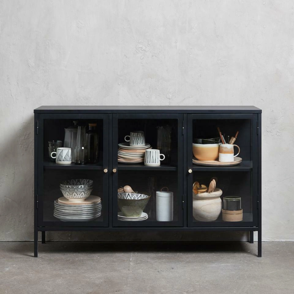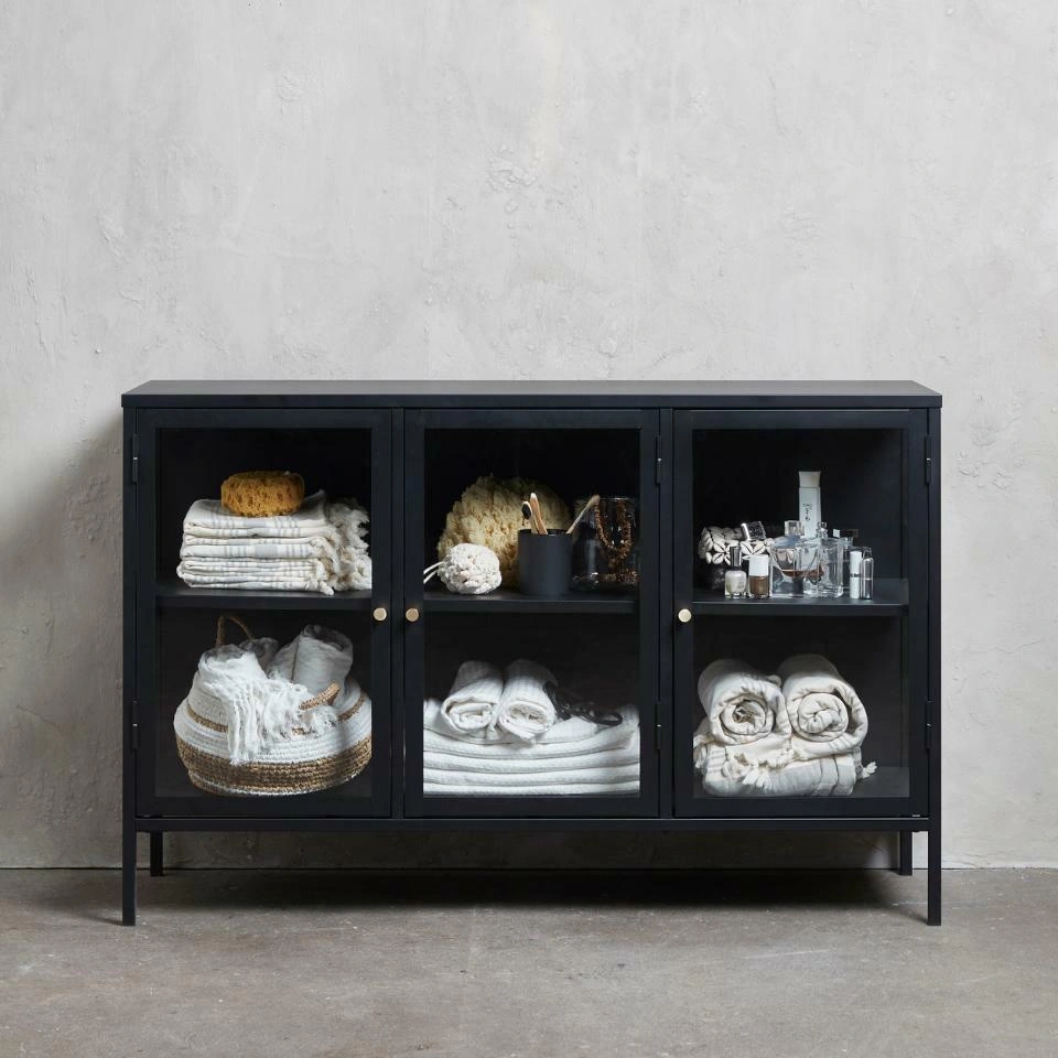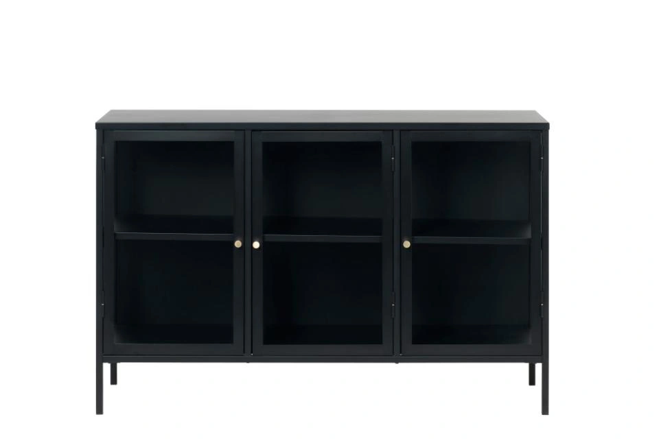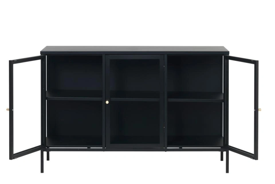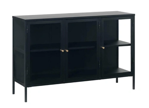 Komoda Carmel marki UNIQUE to czarna, nowoczesna komoda na nóżkach z przeszklonymi drzwiami, która łączy funkcję komody i witryny. Metalowa konstrukcja o szerokości 132 cm i głębokości 40 cm zapewnia stabilne miejsce do przechowywania, a szklane fronty eksponują zawartość, nadając wnętrzu lekkości i elegancji.