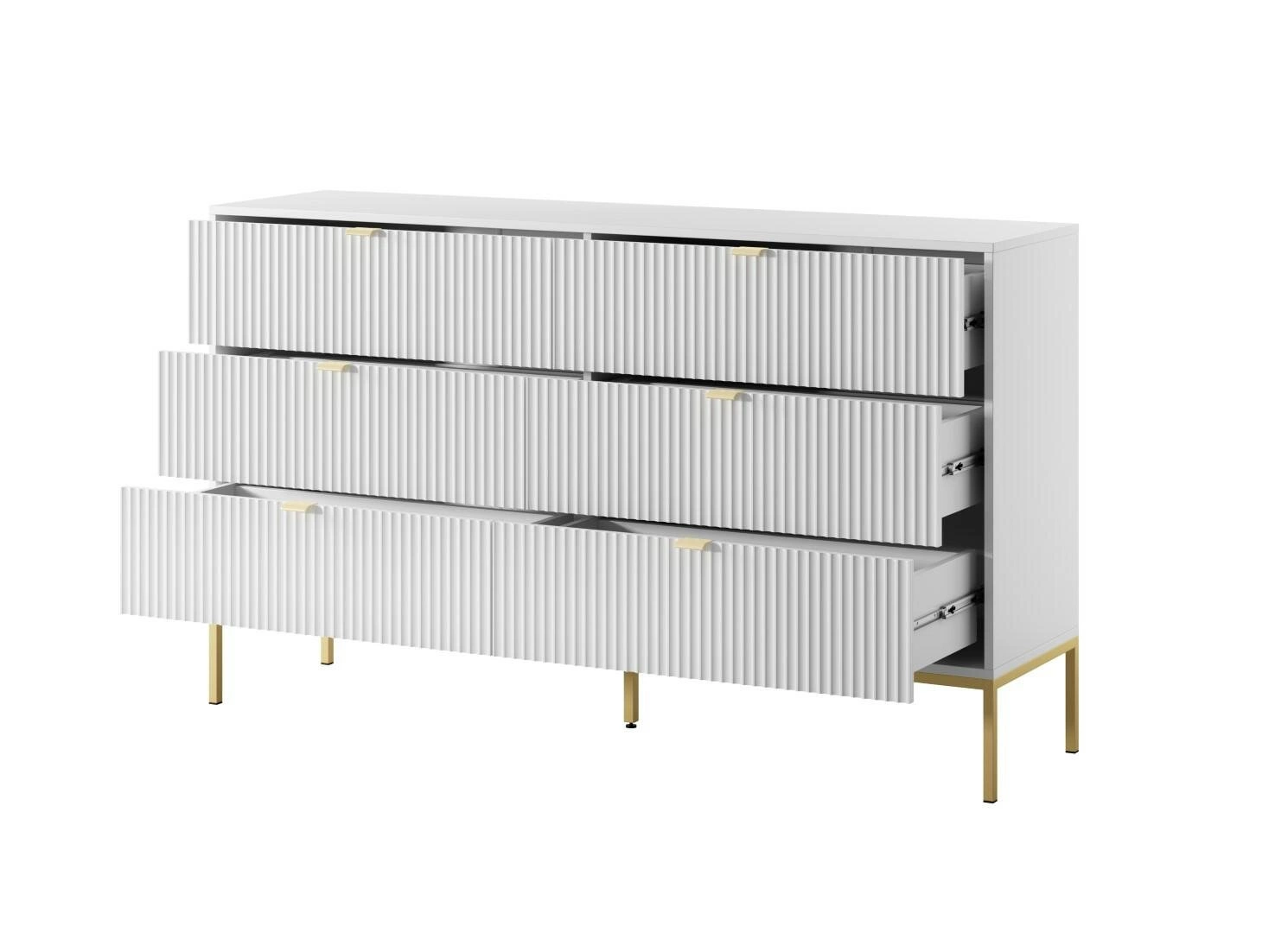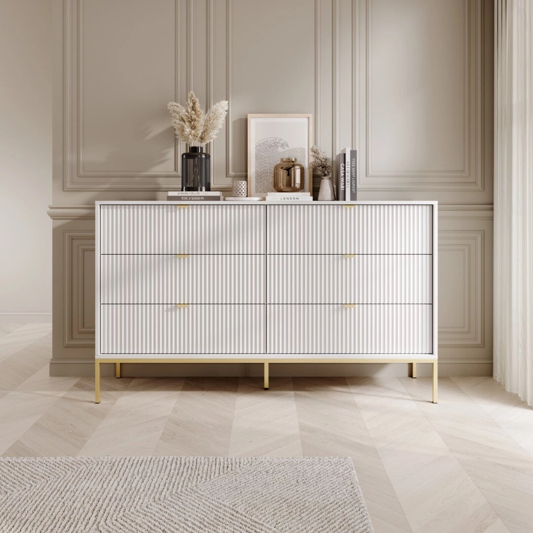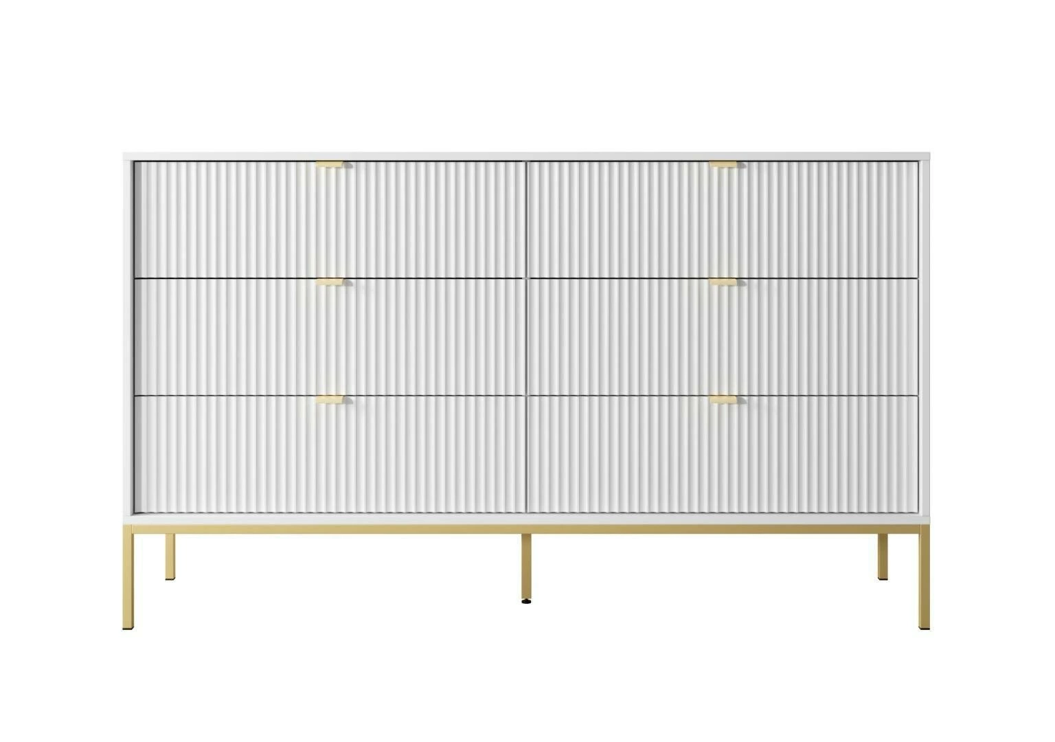 - Połączenie ryflowanych frontów w eleganckiej bieli i złotych uchwytów nadaje komodzie nowoczesny i luksusowy charakter