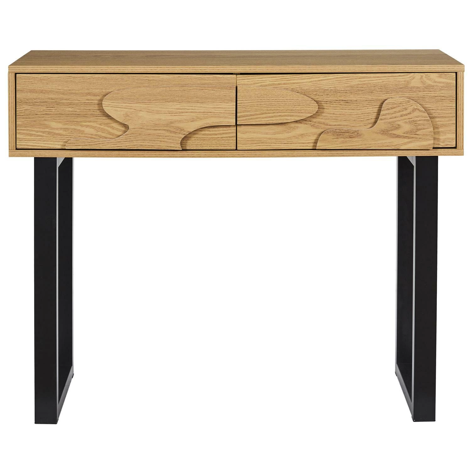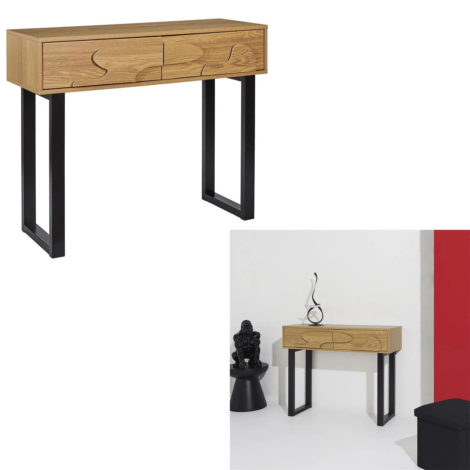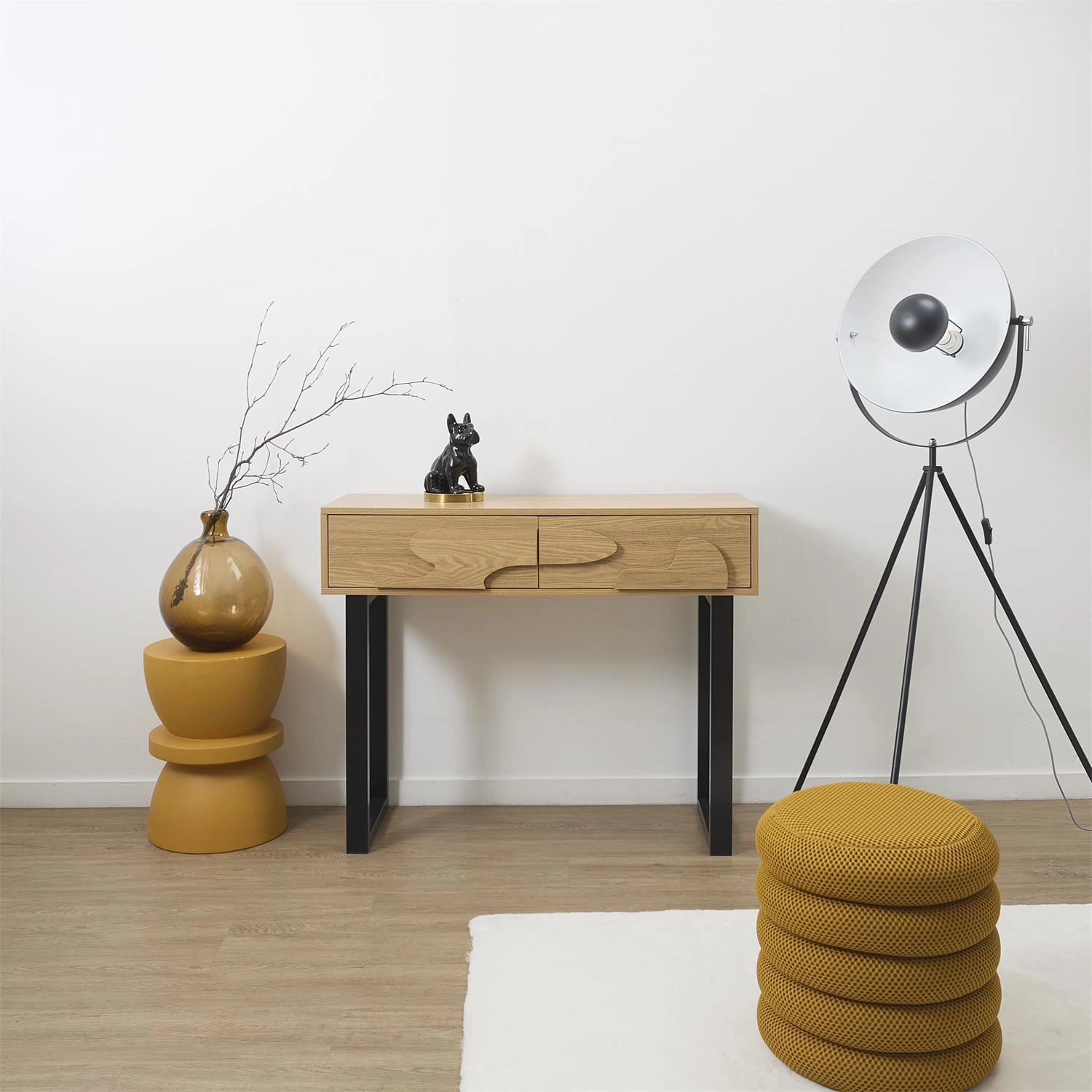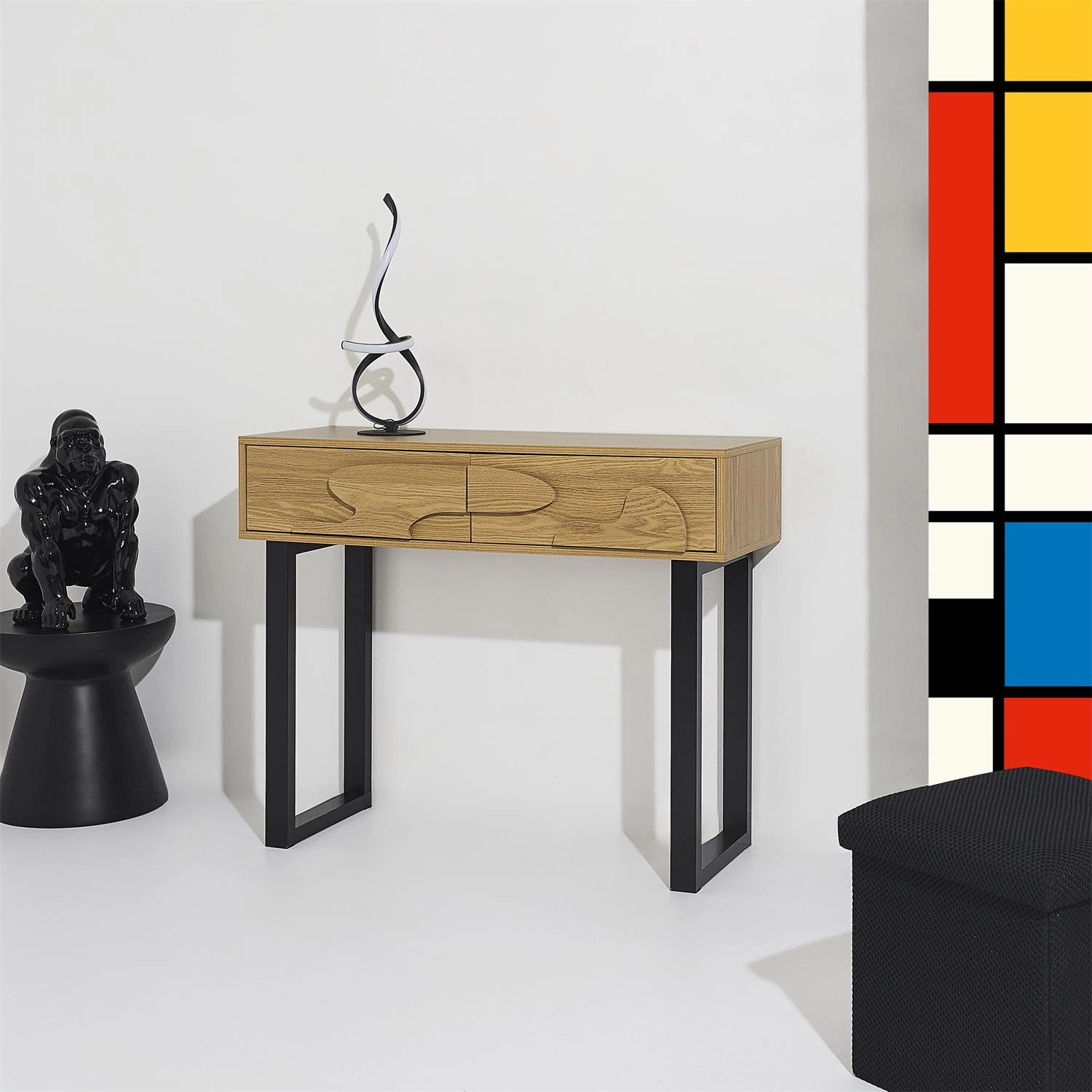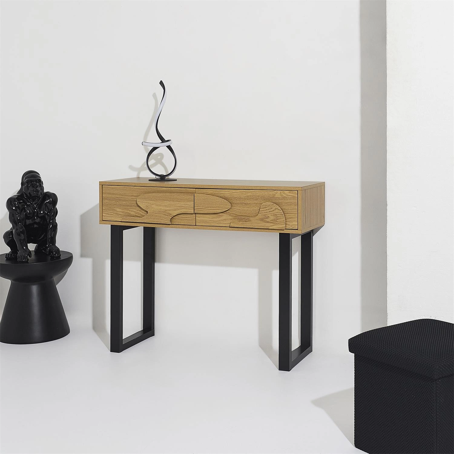 Konsola Calypso marki Intesi to nowoczesny stolik konsolowy w stylu boho japandi, łączący naturalny kolor dębu z elegancką, czarną podstawą. Wyposażony w dwie praktyczne szuflady, prostokątny blat o szerokości 100 cm oraz subtelnie zdobione fronty, doskonale sprawdzi się jako konsola do przedpokoju, salonu lub sypialni. Stabilna metalowa podstawa na płozach i półmatowe wykończenie gwarantują trwałość oraz łatwość czyszczenia.