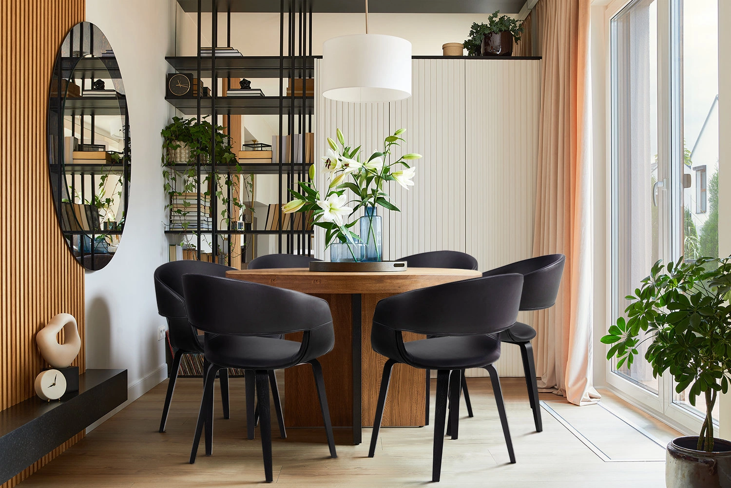 Supernova to krzesło do jadalni, które łączy w sobie nowoczesną estetykę z praktycznością. Czarne, tapicerowane siedzisko wykonane z wysokiej jakości skóry ekologicznej, nie tylko świetnie wygląda, ale także jest łatwe do utrzymania w czystości – wystarczy wilgotna ściereczka, by usunąć drobne zabrudzenia. Wyrazisty, kubełkowy kształt oraz wygodne podłokietniki sprawiają, że nawet długie rodzinne posiłki czy spotkania ze znajomymi upływają w pełnym komforcie.